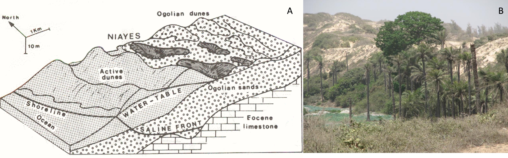 (A) Relations between fresh groundwater and salt-water front in Niayes (from Chateauneuf et al., 1986); (B) Guinean and Sudano-Guinean trees at dune’s foot in a Niaye. Dune tops are covered with steppic (Sahelian) shrubs and herbs.