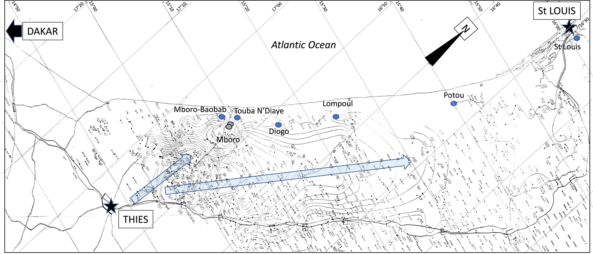 Today, the sub-Guinean domain of Niayes lies in an azonal position compared to the steppe vegetation of the inland Sahel. Tropical plants it contains benefit from a freshwater table close to the surface at the bottom of the interdunes. The level of this freshwater table mainly depends on the rainfall amount and sea-level position. Freshwater recharge originates from Thiès plateau located approximately 25 km to southeast and gradually decreases northward and westward (Figure 2). Contact between the freshwater table and seawater front reaches the surface along the beach, descending through Quaternary sands towards the internal littoral domain (Chateauneuf et al., 1986).