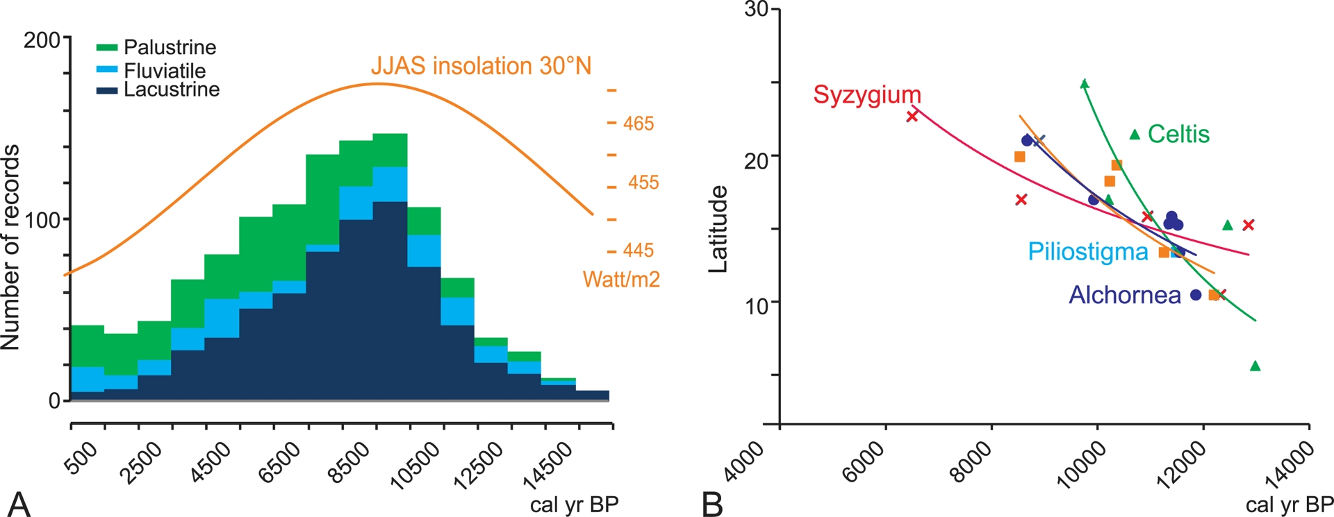 (A) African Humid Period derived from radiometric dating of four lake sediment categories from across Sahara and Sahel perennial (lacustrine) and seasonal (playas) lakes, rivers (fluviatile) and wetlands (palustrine). Insolation curve from Berger and Loutre (1991). (B) Northward migration of tropical trees across North Africa during AHP. Dots show the first appearance of selected tree pollen taxa (Celtis, Alchornea, Syzygium, Piliostigma) at the latitude of the studied sites (Lézine, 2017).