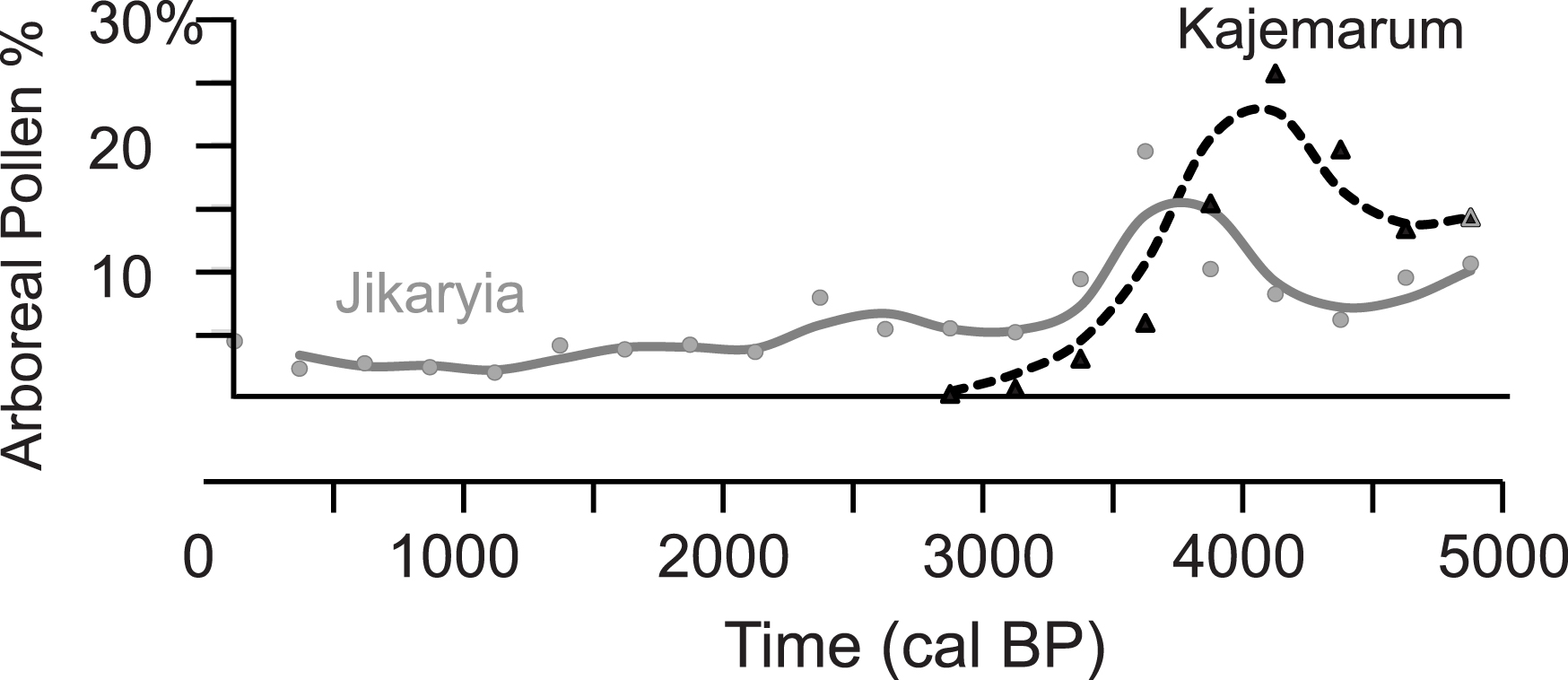 Tree cover at the end of the AHP in the central Sahel. Kajemarum (Salzmann and Waller, 1998) and Jikaryiya (Waller et al., 2007) sites (northern Nigeria) show that trees (Arboreal Pollen %) fall from 4 ka onwards, more or less spectacularly depending on the site.