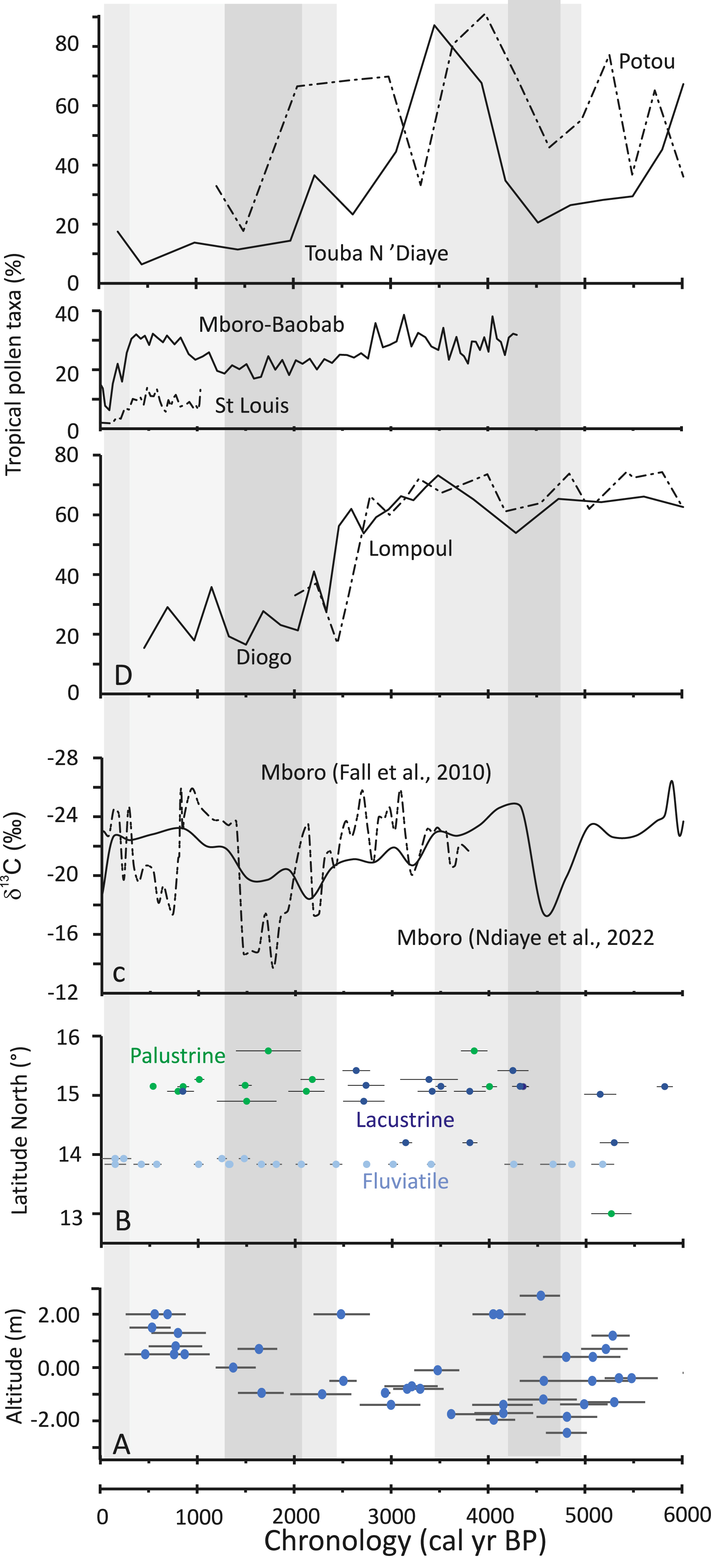 The end of the AHP in Senegal: (A) bleu dots: dated record of sea-level fluctuations as a function of altitude (Table 01); (B) dated hydrological records as a function of latitude (Table 02) (dark blue: lacustrine/high water level; green: palustrine/low water level; light blue: fluviatile); (C) isotopic geochemistry (δ13C) of bulk organic matter from two distinct Niaye depressions at Mboro (Fall et al., 2010; Ndiaye et al., 2022); (D) pollen records (in percentages) of tropical humid (sub-Guinean) taxa in western Senegal (Niayes region and Senegal River delta), from the bottom to the top: Diogo, Lompoul, Mboro-Baobab, St Louis, ToubaN’Diaye and Potou (Fofana et al., 2020; Lemonnier and Lézine, 2021; Lézine, 1988, https://africanpollendatabase.ipsl.fr). Grey bands indicate dry periods.