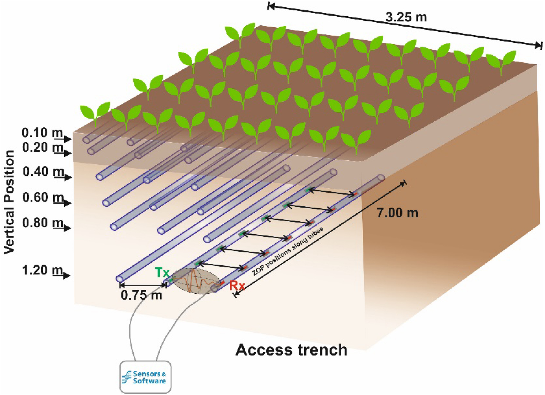 To investigate the different influences on the GPR signal, we used the field MR facilities as a template for the setup of our synthetic forward model (Figure 1). The two facilities were part of the TERENO (TERrestrial ENvironmental Observatories) Eifel/Lower Rhine observatory, located near Selhausen (50°52′N, 6°27′E) and the setup was mirrored in two different soil types. The first was the upper terrace minirhizotron facility (RUT), which was situated in soil classified as Orthic Luvisol with a high stone content (>50%) according to the World Reference Base for Soil Resources (IUSS Working Group WRB, 2007). The second was the lower terrace minirhizotron facility (RLT), which is located in soil classified as Cutanic Luvisol (Ruptic, Siltic) according to the World Reference Base for Soil Resources (ibid.). Both facilities featured 7 m-long horizontal rhizotubes installed at various depths (0.1, 0.2, 0.4, 0.6, 0.8 and 1.2 m), enabling crosshole GPR measurements and acquisition of root imaging using minirhizotron camera systems. Each facility was divided into three replicas (plots) and each plot hosted three horizontal rhizotube per depth, with a horizontal spacing of 0.75 m. Between the different depths a horizontal offset was present to prevent an interference of the rhizotubes with root growth (Figure 1). Above the subsurface the plots operated as regular agricultural fields, where crop management was performed in compliance with regional standards. The crops were sown perpendicular to the rhizotubes. For a detailed description of the construction of the facility we refer to Cai et al. (2016) and for a detailed description of the data acquisition and analysis we refer to Lärm, Bauer, Hermes, et al. (2023). To acquire crosshole GPR measurements within the field MR facilities standardly a 200 MHz PulseEKKO borehole system (Sensors and Software, Canada) was utilized. As an acquisition setup zero-offset profiling (ZOP) was used, whereby the transmitter (Tx) and receiver (Rx) antennae were placed in neighboring rhizotubes and moved simultaneously in parallel positions along the rhizotubes with a step size of 0.05 m.