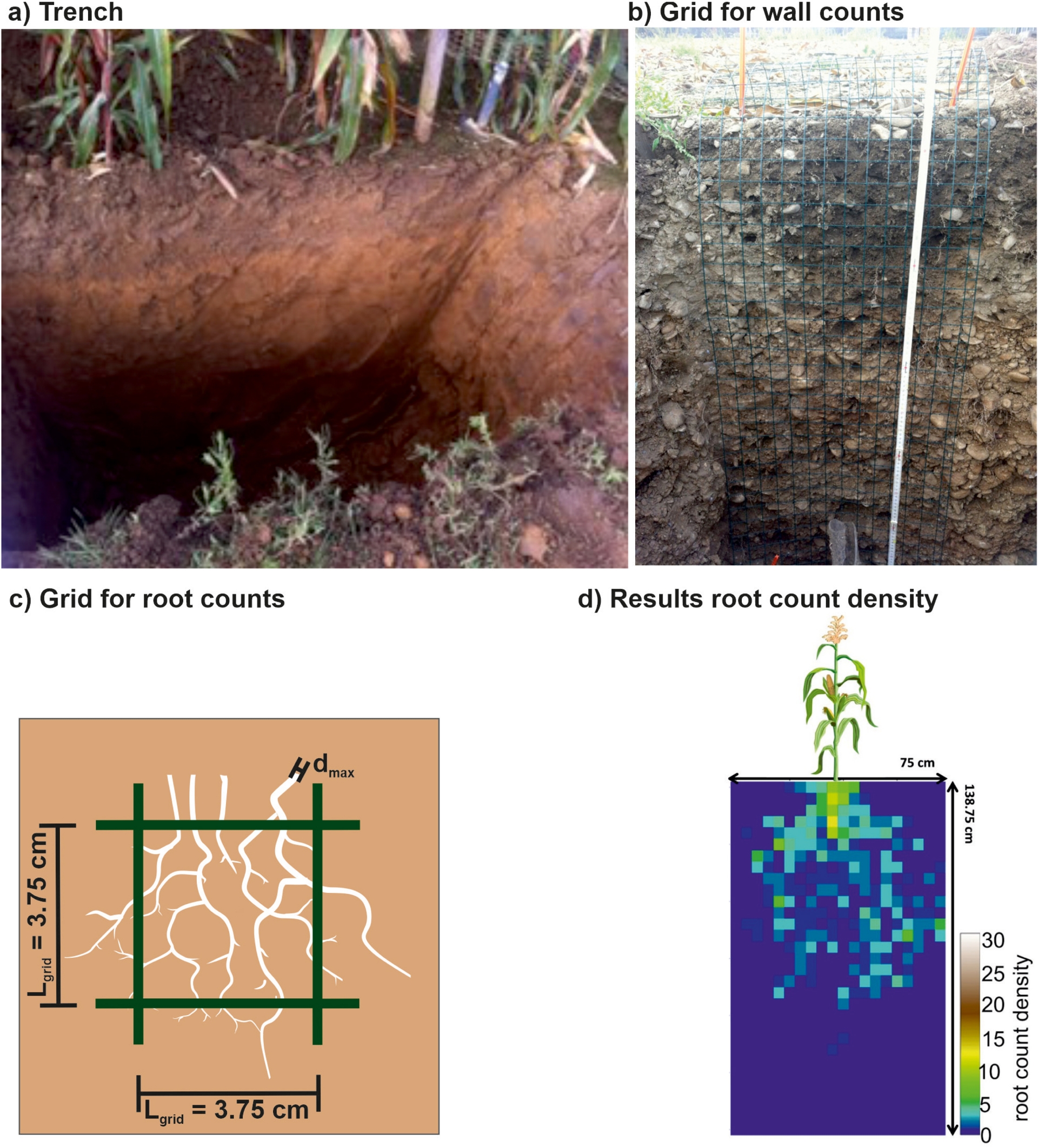 Overview of the trench wall counts to derive the root count density. (a) Finalized trench perpendicular to the maize crop rows. (b) Grid on the trench wall, in which the roots were counted. (c) Schematic illustration of the trench wall root counts for one grid cell with a size of 3.75 cm and (d) Results for the root count density for RUT, adapted from (Klotzsche, Lärm, et al., 2019).