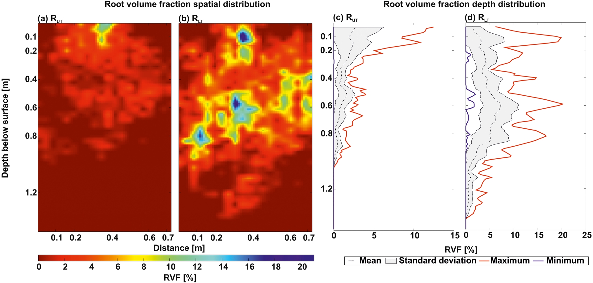 RVF for both field MR facilities with (a,b) RVF values calculated for every grid cell and then interpolated to a cell size of 1 cm. (c,d) RVF depths profiles for RUT and RLT with corresponding mean, standard deviation, maximum and minimum distribution.