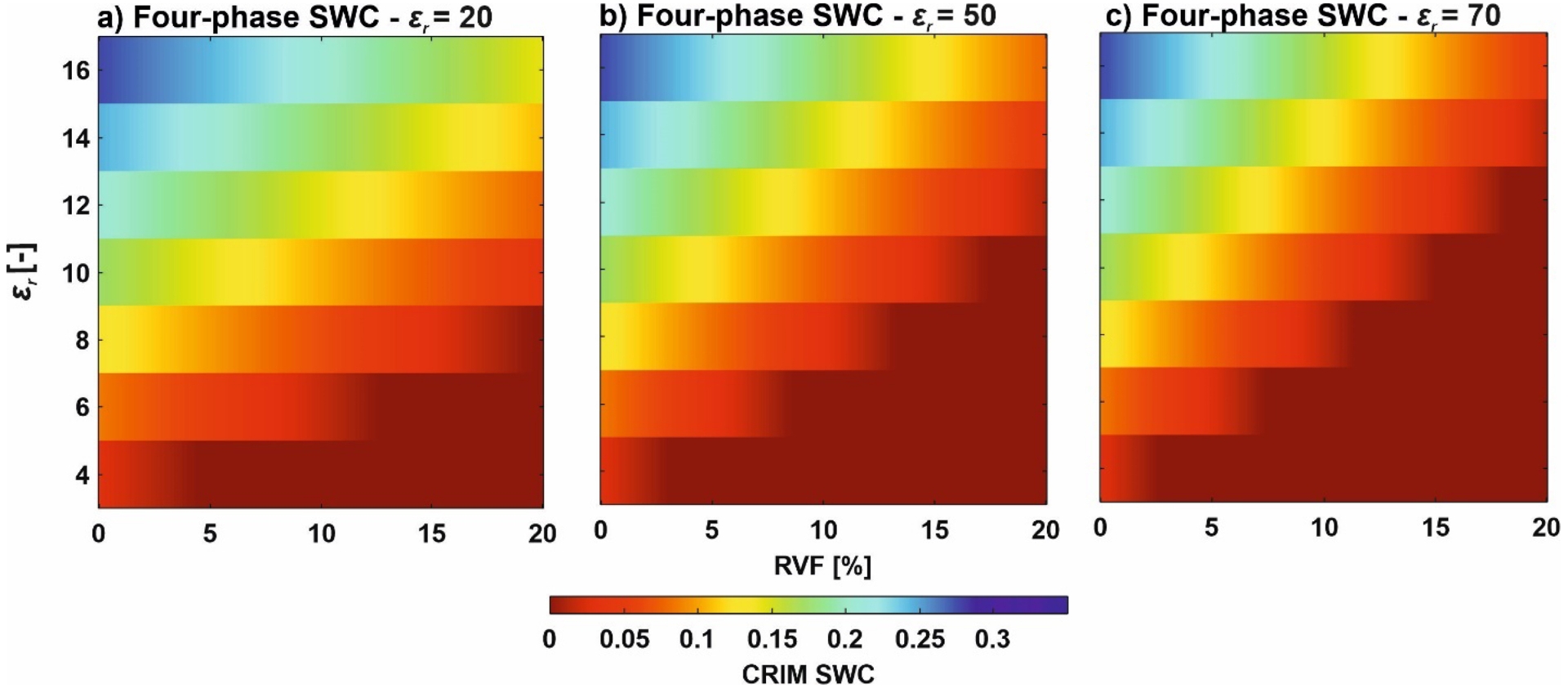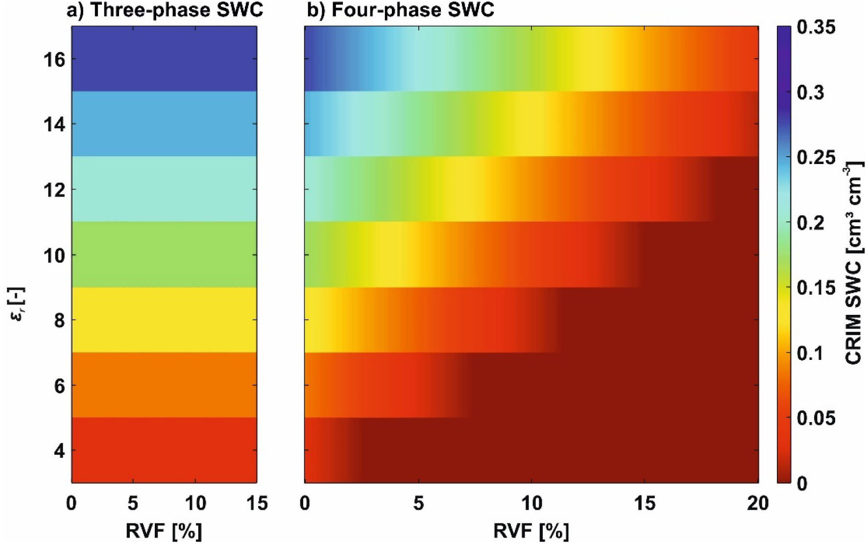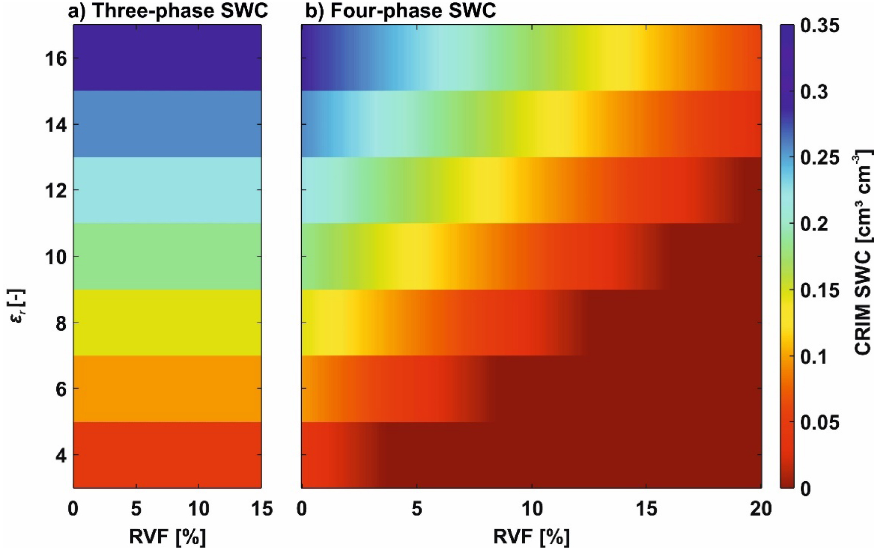 By comparing the results for a range of RVF values for the three-phase and four-phase CRIM, we were able to observe that with increasing root presence, the differences became more considerable (Figure 5). Note that the three-phase SWC was equal to the four-phase SWC with a RVF of 0% (Figure 5a). For lower 𝜀r values the four-phase SWC reached values below zero, in that case in Figure 5b the values were replaced with a SWC of 0 for illustrational purposes.