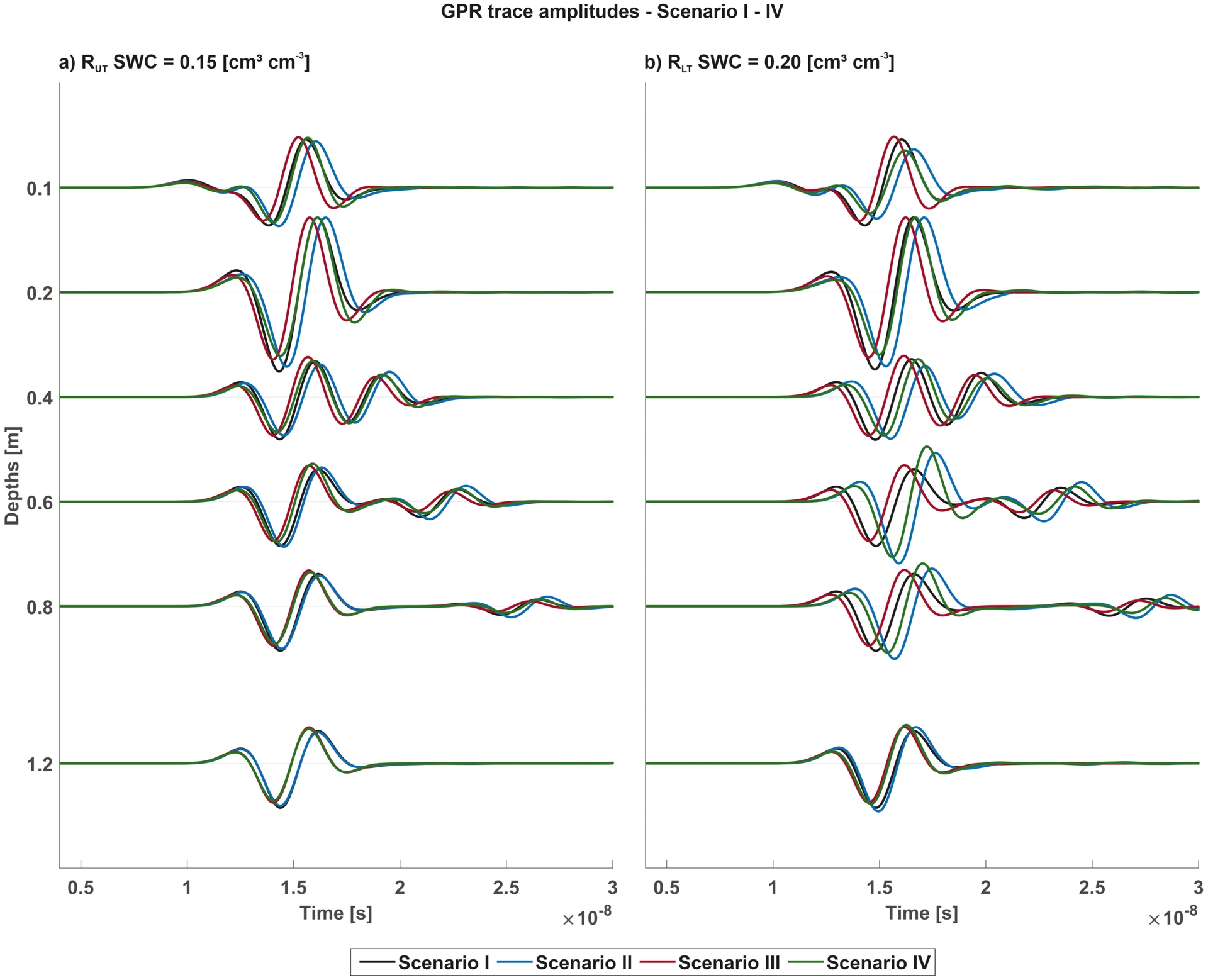 In the first step, we assumed for the four scenarios intermediate SWC conditions for both field MR facilities using a SWC of 0.15 and 0.20 for RUT (Figure 7a) and RLT (Figure 7b), respectively. The differences between the two facilities and their related traces are mainly caused by increased SWC for RLT and hence increased travel time of the EM waves and the different RVF distributions. As for depths below 0.6 m, a reflected wave from the air–soil interface can be observed after 20 ns. We observed generally similar phase and amplitudes with shifts in arrival times between the two facilities. The effects of the varying root distribution in the soil influenced the GPR signals for the different depths could be seen when comparing Scenario I and II. We first noticed a difference in the travel times, whereas the first arrival of the EM wave was delayed for Scenario II (Figure 7). This effect differed between the field MR facilities, whereas with higher SWC of RLT caused the travel time difference between Scenario I and II to increase and the travel time differences for RLT were larger than for RUT. This time shift was caused by the increased 𝜀r associated with the RVF and therefore an overall decreased wave velocity and hence resulted in later arrival times.