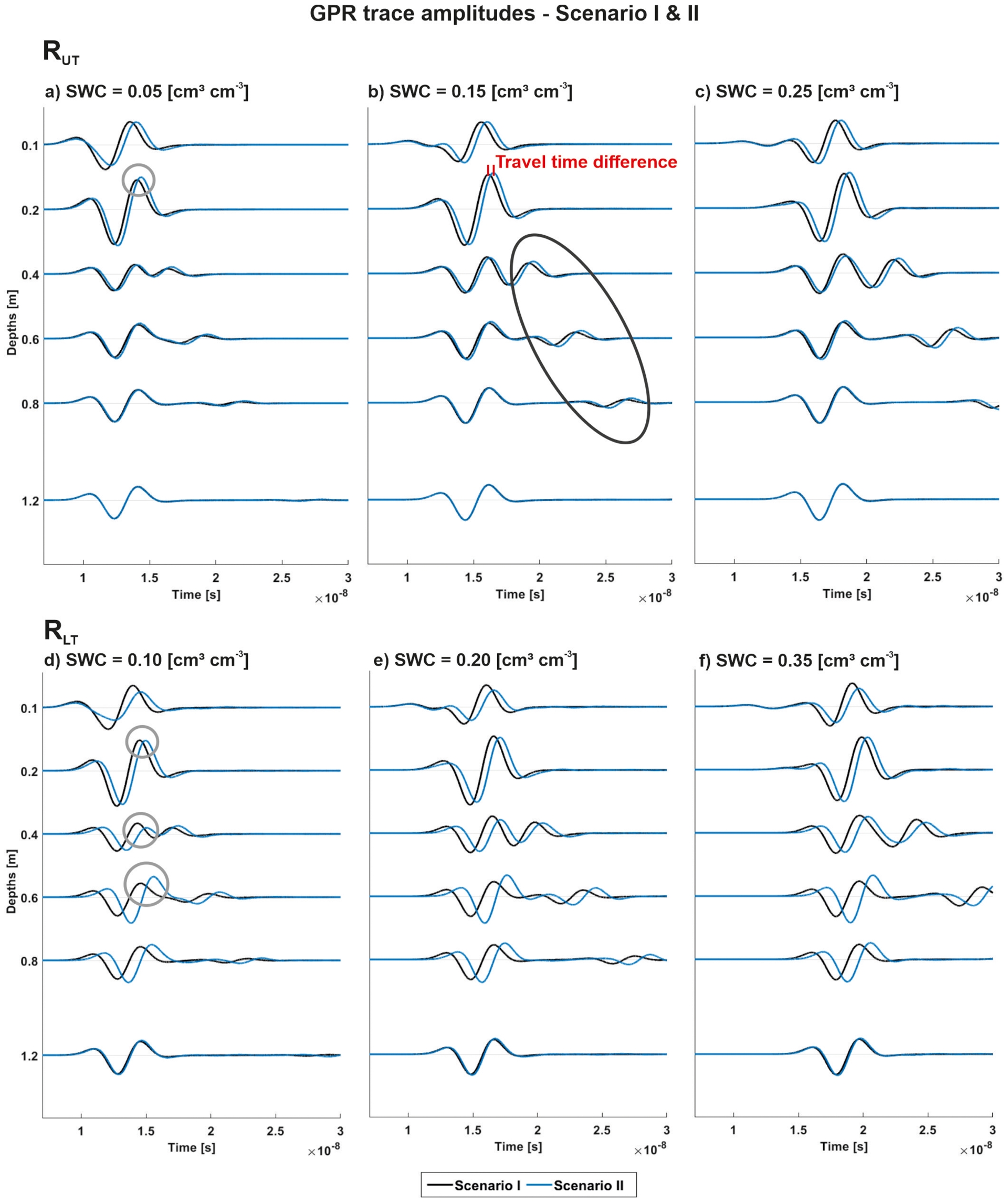 GPR traces modeled for various SWC, where the black and blue solid line indicates Scenario I and II for the different depths of the field MR facilities. The corresponding traces are shown for the different field MR facilities and different soil water content conditions (a–c) for RUT and (d–f) for RLT. The grey circles indicate the first cycle amplitude differences between, the red lines indicate the travel time difference, and the black ellipse indicates the phase shift for the later EM wave arrivals, between Scenario I and II, respectively.