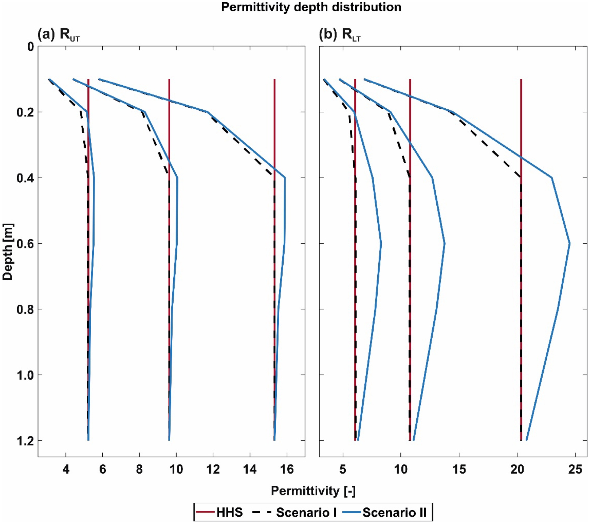 𝜀r depth distributions for both field MR facilities (a,b), where the input 𝜀r indicated as a solid red line, Scenario I indicated as a dashed black line and Scenario II indicated as a solid blue line.