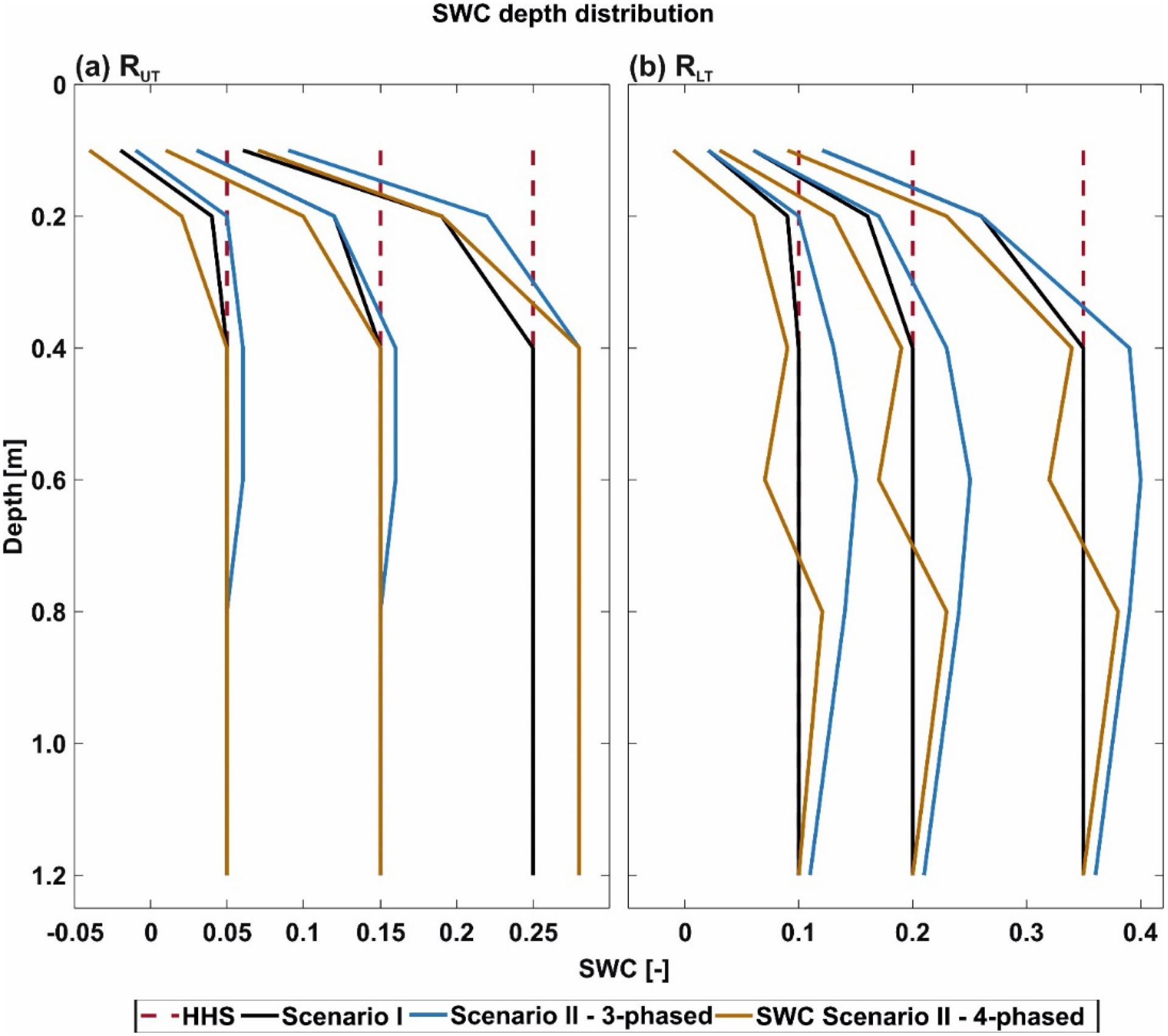 Three-phase SWC for Scenario I, and three-phase and four-phase SWC results for Scenario II for RUT and RLT and different SWC conditions between 0.05–0.35 (cm3⋅cm−3). The error between the three- and four-phase SWC is provided in brackets below.