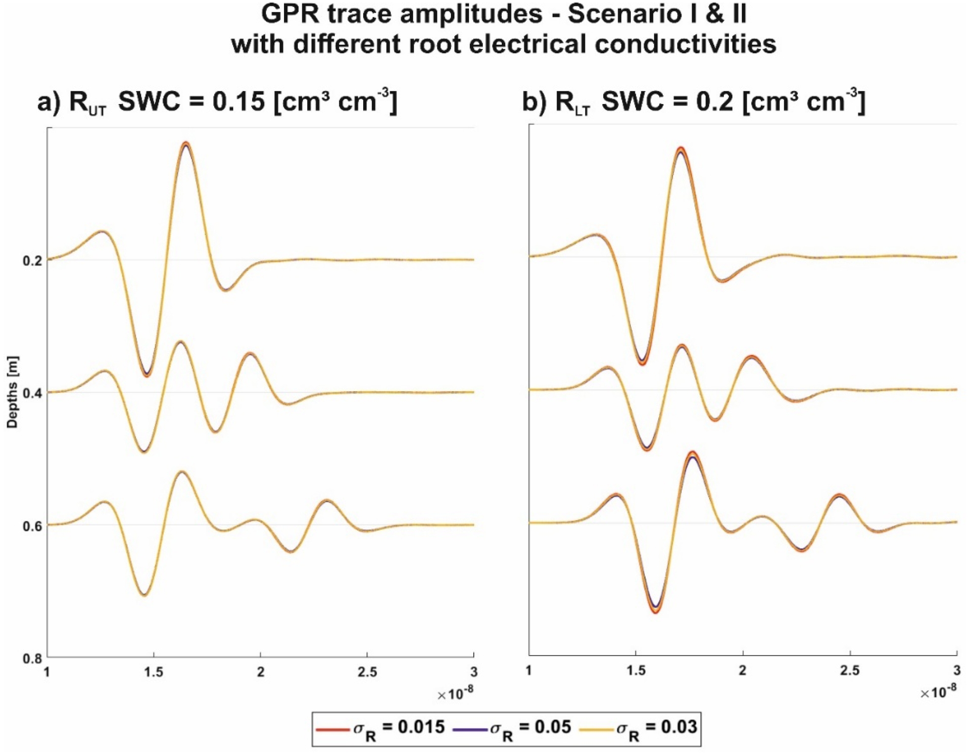 We performed simulation with different root electrical conductivities for Scenario I and II with the SWC of 0.15 cm3⋅cm−3 and 0.2 cm3⋅cm−3 for RUT and RLT, respectively (Figure 13). As expected, the models with the increased 𝜎R and hence higher wave attenuation showed a decreased amplitude of the GPR traces. Note that the effect was increased for domains with a higher RVF, e.g., 0.6 m depth. But, overall, only minor differences in the first cycle amplitudes between the traces of the three cases were visible, indicating that the 𝜎R did not have a large effect on the GPR traces. This finding suggests that in further research with more complex soil or/and root models, the different 𝜎R are not a major contributor on the GPR signals rather than the 𝜎S.