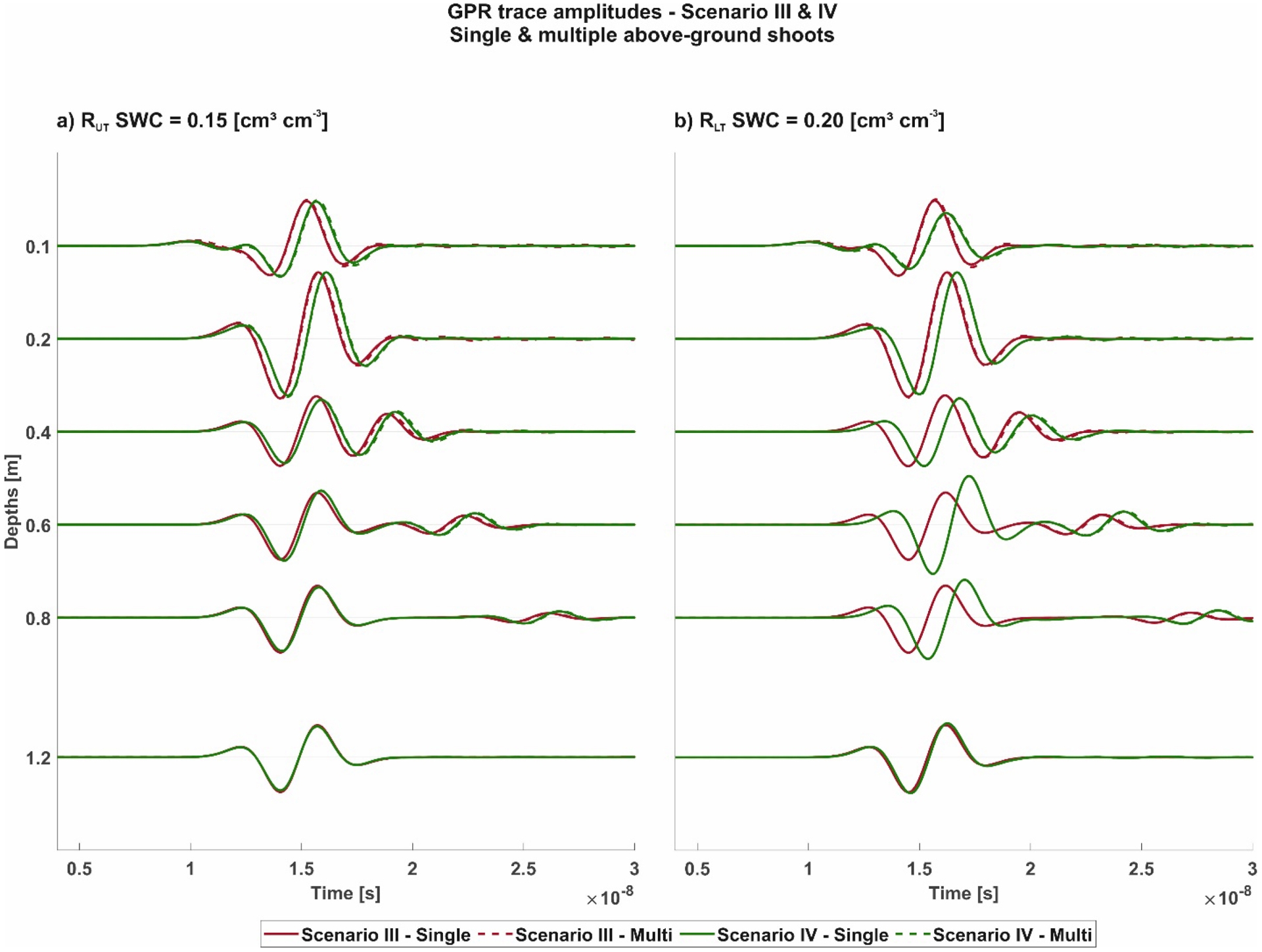 GPR traces modeled for 200 MHz, where the red and green lines indicate Scenario III and IV for the different depths of the field MR facilities, respectively. The solid and dashed line represent the single and multiple above-ground shoots, respectively. The corresponding traces are shown for the different field MR facilities for (a) RUT with a SWC of 0.15 (cm3⋅cm−3) and (b) RLT with a SWC of 0.2 (cm3⋅cm−3).