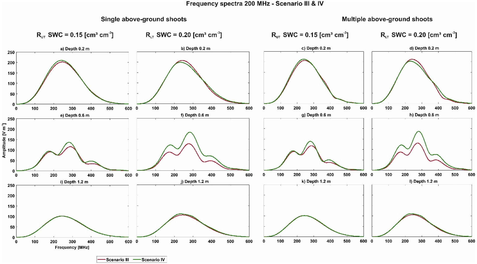 In the frequency spectra of the 200 MHz signal (Appendix B, Figure B2), we observed an influence of the above-ground shoot, but only for the depth of 0.6 m, where the maximum around 300 MHz is significantly larger than for the scenarios without the above-ground shoot. Furthermore, we noticed the same effects on the spectrum as for Scenario I and II, where in the depth 0.2 m an amplitude twice the amplitude as for depth 1.2 m was indicated, caused by the interferences with the reflected and refracted wave. However, no significant difference is noticeable between a single and multiple above-ground shoots.