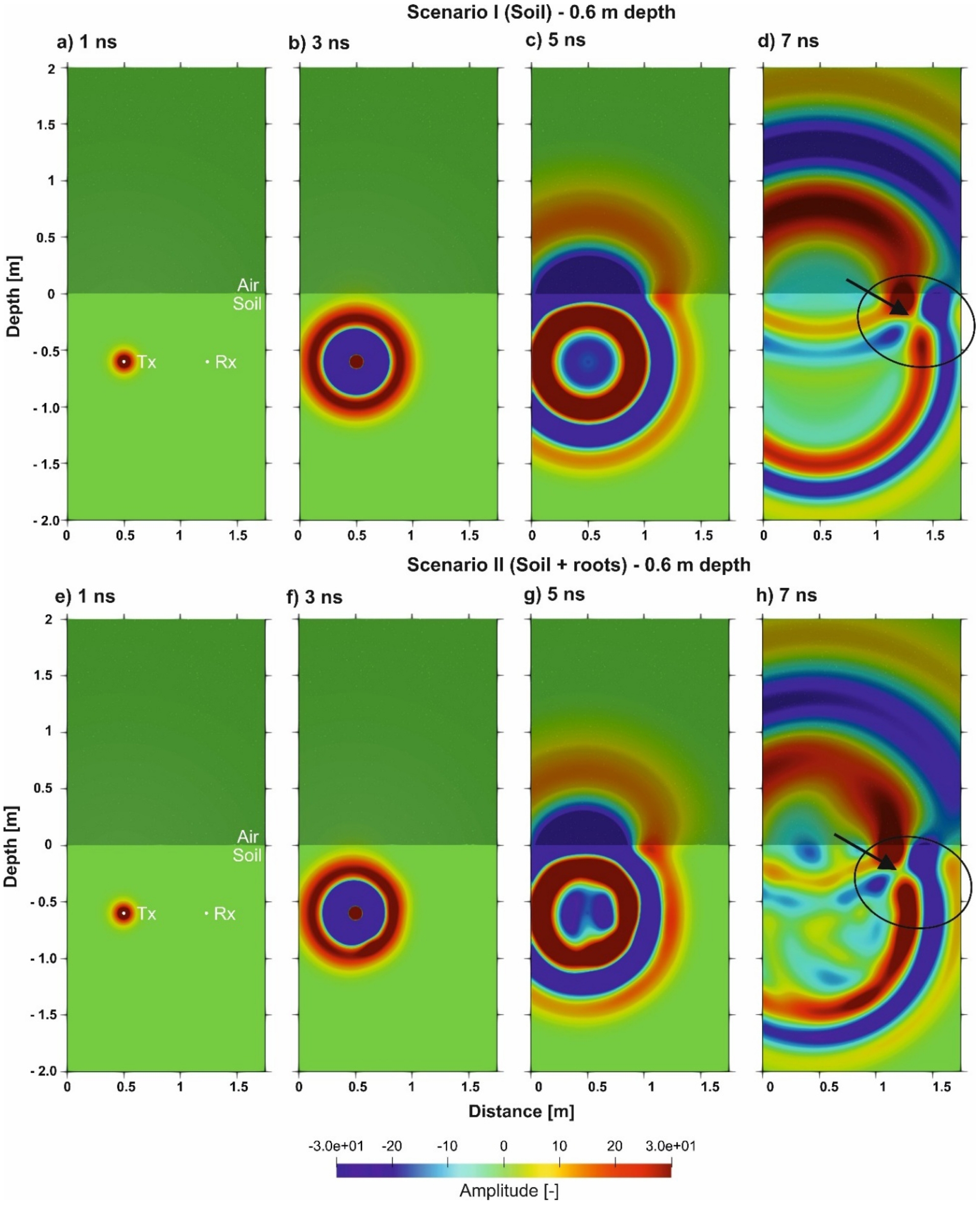 For a better understanding, how the EM waves propagated and interfered in the two-dimensional space with and without root presences, we analyzed image plots for various time steps (1 ns, 3 ns, 5 ns and 7 ns). For both field MR facilities the highest RVF is present at 0.2 m depth, hence we first investigated those EM propagations for RLT with an input SWC of 0.10 cm3⋅cm−3, see Figure 12. Thereby, we noticed for Scenario I, that the EM wave propagated relatively circular and uniform through the soil, whereas for Scenario II, the EM wave showed scatterings and amplitude changes over the model domain. At 3 ns and 5 ns (Figure 12b and c, f and g) the development of the different wave types at the soil–air interface was visible, where the wave in air travels faster than the wave in the soil. At later times of 7 ns (Figure 12d,h) an event was observed with increased amplitude (Figure 12d, black circle). Below, these positive interferences, a time shift and a diminished amplitude were present (Figure 12d, black arrow). Both events were related to the phase and amplitude of the corresponding measured traces (Figure 8). The image plots for the depth 0.6 m for the same scenarios showed overall less wave interferences, although the wave interaction close to the surface was observed as well (see Appendix C, Figure C1).