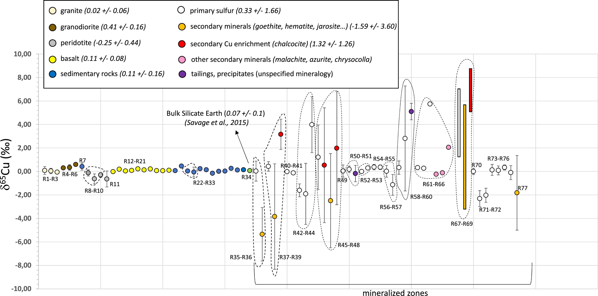 Type of sample and associated bibliographic reference for rocks, mineralization (ore) and alteration products; all data are presented in the form of δ65Cu (in units of ‰) whose reference material is SRM-NIST976 (see Equation (1)). This is the case for all figures. For each reference, is reported a mean value associated with a standard deviation and the number of samples. Sometimes there is only one data. The points surrounded by a dotted line are from the same study and the reference (ex: S-6) allows to find the author and the associated values in the legend. R1: Granite from Lachlan Fold Belt (SE Australia) (0.08 ± 0.34 (n = 32); W. Li et al., 2009); R2: Granite from porphyry-type ore bodies (Lhasa, Tibet) (0.04 ± 0.23 (n = 4); Y.-C. Zheng et al., 2019); R3: Diorite from Central Asian Orogenic Belt (West China) (−0.06 (n = 1); Zhao et al., 2022); R4: Granodiorite (Colorado, USA) (= GSP-2, Certified Reference Material) (0.3 (n = 1); R.-R. Wang et al., 2022); R5: Granodiorite from porphyry-type ore bodies (Lhasa, Tibet) (0.34 ± 0.24 (n = 36); Y.-C. Zheng et al., 2019); R6: Granodiorite from Qulong porphyry copper deposit (Tibet) (0.59 ± 0.13 (n = 14); Nie et al., 2012); R7: Mafic enclave (Lhasa, Tibet) (0.42 ± 0.3 (n = 12); Y.-C. Zheng et al., 2019); R8: Lherzolite from Central Asian Orogenic Belt (West China) (−0.12 ± 0.27 (n = 11); Zhao et al., 2022); R9: Hornblende Lherzolite from Central Asian Orogenic Belt (West China) (−0.63 ± 0.42 (n = 6); Zhao et al., 2022); R10: Olivine Gabbro from Central Asian Orogenic Belt (West China) (−0.3 ± 0.2 (n = 8); Zhao et al., 2022); R11: Cratonic peridotite (China) (−0.64 ± 0.68 (n = 30); S.-A. Liu, Huang et al., 2015); R12: Basalt (Iceland) (= BIR, Certified Reference Material) (−0.02 (n = 1); W. Li et al., 2009); R13: Columbia River Basalt (USA) (= BCR-1/2, Certified Reference Material) (0.19 (n = 1); K. V. Sullivan et al., 2022); R14: Diabase (Virginia, USA) (= W-2a Certified Reference Material) (0.04 (n = 1); K. Sullivan et al., 2020); R15: Hawaiian basalt (USA), (= BHVO-2, Certified Reference Material) (0.08 (n = 1); R.-R. Wang et al., 2022); R16: Basalt from Country Rock (Huangshannan, Huanshandong, Hulu and Tulaergen deposits, Eastern Tianshan, China) (0.22 ± 0.04 (n = 2); Zhao et al., 2022); R17: Basalt (Southwest Pacific Ocean, Niuatahi volcan, Tonga) (0.13 ± 0.10 (n = 3); Z. Wang et al., 2019); R18: Dacite (Southwest Pacific Ocean, Niuatahi volcan, Tonga) (0.21 ± 0.1 (n = 9); Z. Wang et al., 2019); R19: Basalt (Hainan Island, China) (0.07 (n = 1); J.-H. Liu et al., 2022); R20: Andesite (Oregon, USA), (= AGV-2, Certified Reference Material) (0.06 (n = 1); K. V. Sullivan et al., 2022); R21: Andesitic breccia tuff from Country Rock (Huangshannan, Huanshandong, Hulu and Tulaergen deposits, Eastern Tianshan, China) (0.10 ± 0.03 (n = 3); Zhao et al., 2022); R22: Cambrian micashist (southwest France) (0.07 (n = 1); El Azzi et al., 2013); R23: Biotite quartz schist from Country Rock (Huangshannan, Huanshandong, Hulu and Tulaergen deposits, Eastern Tianshan, China) (0.46 ± 0.04 (n = 2); Zhao et al., 2022); R24: Shale (Marcellus formation, USA) (0.04 ± 0.16 (n = 8); Mathur, Jin, et al., 2012); R25: Black shales (South Africa) (−0.05 ± 0.42 (n = 11); Chi-Fru et al., 2016); R26: Black shales (Gabon) (0.23 ± 0.09 (n = 8); Chi-Fru et al., 2016); R27: Black shales (Maokou formation, China) (0.14 ± 0.09 (n = 5); Lv et al., 2016); R28: Cody Shale (USA) (= SCo-1, Certified Reference Material) (−0.16 (n = 1); Sossi et al., 2014); R29: Loess (China) (0.01 ± 0.03 (n = 2); W. Li et al., 2009); R30: Greywacke (Goa state, India) (0.03 (n = 1); Little, Munson, et al., 2019); R31: Sandstone (0.26 ± 0.12 (n = 2); Zhao et al., 2022); R32: Bedrock (Fluvio-lacustrine sediments) (China) (0.12 ± 0.01 (n = 2); Ren et al., 2022); R33: Tuffite (Slovakia) (0.14 (n = 1); Bigalke, Weyer, Kobza, et al., 2010); R34: Bulk Silicate Earth (MORB + OIB + Komatite + Peridotite) (0.07 ± 0.1; Savage et al., 2015); R35: Mix of chalcopyrite, chalcocite, djurleite, and covellite from Canariaco district (Peru) (0.03 ± 0.85 (n = 37); Mathur, Ruiz, Casselman, et al., 2012); R36: Mix of goethite and hematite from Canariaco district (Peru) (−5.35 ± 2.28 (n = 7); Mathur, Ruiz, Casselman, et al., 2012); R37: Mix of chalcopyrite and pyrite from Urumieh-Dokhtar magmatic belt (Iran) (0.43 ± 0.4 (n = 10); Mirnejad et al., 2010); R38: Mix of hematite and goethite from Urumieh-Dokhtar magmatic belt (Iran) (−3.84 ± 4.49 (n = 10); Mirnejad et al., 2010); R39: Supergene chalcocite from Urumieh-Dokhtar magmatic belt (Iran) (3.16 ± 1.29 (n = 11); Mirnejad et al., 2010); R40: Cu–Co ore (= SU-1, Certified Reference Material) (−0.02; Chapman et al., 2005); R41: Mix of Pyrite, chalcopyrite, galene, and sericite from Prospect Gulch abandoned mine (Colorado, USA) (−0.13 ± 0.1 (n = 2); Fernandez and Borrok, 2009); R42: Chalcopyrite ore (skarn type) (China) (−1.61 ± 0.55 (n = 3); Mathur, Munk, et al., 2014); R43: Chalcopyrite and pyrite (massive sulfide, Spain) (−1.91 ± 2.6 (n = 15); Mathur, Munk, et al., 2014); R44: Chalcopyrite and pyrite (porphyry copper deposit, Chile) (3.98 ± 2.38 (n = 4); Mathur, Munk, et al., 2014); R45: Chalcopyrite and pyrite from 9 porphyry copper deposits (USA, Chile, Turkey) (1.21 ± 2.74 (n = 7); Mathur, Titley, et al., 2009); R46: Secondary chalcocite (0.53 ± 4.89 (n = 15); Mathur, Titley, et al., 2009); R47: Leach cap (mix of hematite, jarosite and goethite) (−2.49 ± 4.01 (n = 5); Mathur, Titley, et al., 2009); R48: Oxide (1.98 ± 4.81 (n = 10); Mathur, Titley, et al., 2009); R49: Chalcopyrite (USA, Peru) (0.04 ± 0.52 (n = 38); Larson et al., 2003); R50: Pyrite from Mining district of Taxco (southern Mexico) (0.18 ± 0.28 (n = 4); Dótor-Almazán et al., 2017); R51: Tailings and precipitates from mining district of Taxco (southern Mexico) (−0.18 ± 0.70 (n = 14); Dótor-Almazán et al., 2017); R52: Chalcopyrite (Co