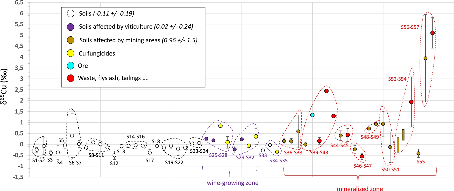Type of sample and associated bibliographic reference for soils; The points surrounded by a dotted line are from the same study. S1: Fluvisol (Glen Feshie chronosequence, Scotland, United Kingdom) (−0.25 ± 0.11 (n = 20); Vance, Matthews, et al., 2016); S2: Andisol from Hawaii (USA) (−0.08 ± 0.38 (n = 54); Vance, Matthews, et al., 2016); S3: Lateritic soils from Amazonia (Brazil) (−0.39 ± 0.12 (n = 8); Guinoiseau et al., 2017); S4: Lateritic soils from Goa state (India) (−0.37 ± 0.33 (n = 14); Little, Munson, et al., 2019); S5: Lateritic soils from Penglai weathering profile (Hainan Island, China) (−0.05 ± 0.15 (n = 19); J.-H. Liu et al., 2022); S6: Saprolitic soils on basalt (South Carolina, USA) (0.4 ± 1 (n = 17); S.-A. Liu, Teng, et al., 2014); S7: Soils on basalt from Hainan Island (China) (0.01 ± 0.16 (n = 19); S.-A. Liu, Teng, et al., 2014); S8: Arenosol from the French Soil Quality Monitoring (France) (−0.15 (n = 1); Fekiacova et al., 2015); S9: Cambisol (on basalt) from the French Soil Quality Monitoring (France) (0.09 (n = 1); Fekiacova et al., 2015); S10: Cambisol (on granit) from the French Soil Quality Monitoring (France) (0.01 (n = 1); Fekiacova et al., 2015); S11: Podzol from the French Soil Quality Monitoring (France) (−0.14 (n = 1); Fekiacova et al., 2015); S12: Soils on Marcellus formation (Pennsylvania, USA) (−0.5 ± 0.19 (n = 33); Mathur, Jin, et al., 2012); S13: Paddy soil, gley horizon (Suzhou, Eastern China) (−0.09 ± 0.08 (n = 33); R.-R. Wang et al., 2022); S14: Liaohe plain Soil (= GBW07425 (GSS-11, Certified Reference Material) (−0.07 (n = 1); K. V. Sullivan et al., 2022); S15: Paddy soil (GBW07443) (GSF-3, Certified Reference Material) (−0.04 (n = 1); K. V. Sullivan et al., 2022); S16: Soil from North China Plain (GBW07389) (GSS-33, Certified Reference Material) (−0.06 (n = 1); K. V. Sullivan et al., 2022); S17: Deeper horizon from retisol (Yonne Plateau, France) (−0.38 ± 0.15 (n = 19); Kusonwiriyawong, Bigalke, Cornu, et al., 2017); S18: Carbonatic alluvial soil (floodplain, Switzerland) (−0.08; Kusonwiriyawong, Bigalke, Abgottspon, et al., 2016); S19: Skeletic cambisol developed on slate (Germany) (−0.15 ± 0.13 (n = 4); Bigalke, Weyer and Wilcke, 2011); S20: Dystric cambisol on sandstone (Slovakia) (−0.06 ± 0.12 (n = 7); Bigalke, Weyer and Wilcke, 2011); S21: Haplic podzol (Germany) (−0.20 ± 0.31 (n = 10); Bigalke, Weyer and Wilcke, 2011); S22: Haplic podzol (Slovakia) (−0.15 ± 0.08 (n = 6); Bigalke, Weyer and Wilcke, 2011); S23: Cultivated paddy soils (Mun River Basin, Thailand) (0.04; X. Zheng et al., 2023); S24: Abandoned paddy soils (Mun River Basin, Thailand) (0.06 (n = 1); X. Zheng et al., 2023); S25: Vertic cambisol (Vineyard catchment, Italia) (0.26 ± 0.08 (n = 8); Blotevogel, Oliva, et al., 2018); S26: Calcaric cambisol (Vineyard catchment, Italia) (0.18 ± 0.03 (n = 7); Blotevogel, Oliva, et al., 2018); S27: Fungicides (Cu sulfates) (0.85 ± 0.05 (n = 2); Blotevogel, Oliva, et al., 2018); S28: Fungicides (Cu hydroxydes) (0.09 ± 0.27 (n = 8); Blotevogel, Oliva, et al., 2018); S29: Fine clays fraction from Cambisol (Vineyard catchment) (−0.23 ± 0.16 (n = 8); Babcsanyi, Chabaux, et al., 2016); S30: Silt fraction from Cambisol (Vineyard catchment) (0.23 ± 0.04 (n = 4); Babcsanyi, Chabaux, et al., 2016); S31: Fungicides (Cu sulfates) (−0.07 ± 0.01 (n = 2); Babcsanyi, Chabaux, et al., 2016); S32: Fungicides (Cu hydroxydes) (0.36 ± 0.36 (n = 4); Babcsanyi, Chabaux, et al., 2016); S33: Soils from Bordeaux (Vineyard catchment, France) (−0.28 ± 0.03 (n = 3); Petit, Schäfer, et al., 2013); S34: Soils from Banyuls (Vineyard catchment, France) (−0.03 ± 0.03 (n = 2); El Azzi et al., 2013); S35: Cu fungicides (−0.34 (n = 1); El Azzi et al., 2013); S36: Dystric Cambisol (1 km–3.8 km from smelter, Slovakia) (0.15 ± 0.13 (n = 12); Bigalke, Weyer, Kobza, et al., 2010); S37: Stagni eutric cambisol (0.14 ± 0.13 (n = 6); Bigalke, Weyer, Kobza, et al., 2010); S38: Waste products (slag, ash, solid waste) (Slovakia) (0.59 ± 0.75 (n = 5); Bigalke, Weyer, Kobza, et al., 2010); S39: Top soils from Panhihua city area (Sichuan province, China) (−0.01 ± 0.11 (n = 19); Xia et al., 2023); S40: Ore from Panhihua city area (Sichuan province, China) (1.34 (n = 1); Xia et al., 2023); S41: Fly ash from Panhihua city area (Sichuan province, China) (0.16 ± 0.16 (n = 3); Xia et al., 2023); S42: Coal from Panhihua city area (Sichuan province, China) (2.44 (n = 1); Xia et al., 2023); S43: Smelting slag from Panhihua city area (Sichuan province, China) (1.29 (n = 1); Xia et al., 2023); S44: Contaminated soils (Tsumeb district, Namibia) (0.4 ± 0.22 (n = 8); Kribek et al., 2018); S45: Slag flotation tailings, smelter dust … (Tsumeb district, Namibia) (0.43 ± 0.3 (n = 18); Kribek et al., 2018); S46: Polluted soils from Copperbelt (Zambia) (−0.23 ± 0.18 (n = 13); Mihaljevic et al., 2018); S47: Concentrates processed in the smelter (Zambia) (−0.55 ± 0.14 (n = 4); Mihaljevic et al., 2018); S48: Contaminated soils from coal mining area (Suixi County, soutwest Huaibei city, China) (0.72 ± 0.16 (n = 17); Ren et al., 2022); S49: Flying ash coal mining area (Suixi County, soutwest Huaibei city, China) (0.92 (n = 1); Ren et al., 2022); S50: Soils from mining region of Taxco area (southern Mexico) (0.94 ± 0.57 (n = 5); Dótor-Almazán et al., 2017); S51: Tailing and precipitates from mining region of Taxco area (southern Mexico) (−0.13 ± 0.7 (n = 15); Dótor-Almazán et al., 2017); S52: Soil close to abandoned Dalseong Cu–W mine (Republic of Korea) (−0.46 to 0.32 (range); Kim et al., 2023); S53: Soil downstream the adit seepage (abandoned Dalseong Cu–W mine, Republic of Korea) (0.41–1.12 (range); Kim et al., 2023); S54: Adit seepages from Dalseong Cu–W mine (Republic of Korea) (1.94± 1.15 (n = 9); Kim et al., 2023); S55: Soils (colluviosol or leptosol) on limestone Marseille (−0.41 ± 0.2 (n = 9); Gelly e