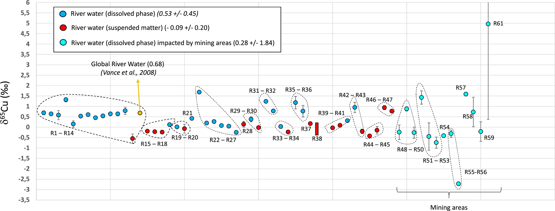 Type of sample and associated bibliographic reference for river waters. R1: Amazon River (Brazil) (0.69 ± 0.09 (n = 3); Vance, Archer, et al., 2008); R2: Brahmaputra River (India) (0.64 (n = 1); Vance, Archer, et al., 2008); R3: Nile River (Sudan, Egypt) (0.58 ± 0.22 (n = 18); Vance, Archer, et al., 2008); R4: Chang-Jiang (Yangtze) River (China) (1.32 ± 0.1 (n = 13); Vance, Archer, et al., 2008); R5: Missouri River (USA) (0.15 ± 0.16 (n = 4); Vance, Archer, et al., 2008); R6: Kalix River (Sweden) (0.53 ± 0.07 (n = 7); Vance, Archer, et al., 2008); R7: River from Kamtchanka (Russia) (0.6 (n = 1); Vance, Archer, et al., 2008); R8: Ottawa River (Canada) (0.45 ± 0.06 (n = 2); Vance, Archer, et al., 2008); R9: Tocantins River (Brazil) (0.54 ± 0.09 (n = 3); Vance, Archer, et al., 2008); R10: Volga River (Russia) (0.64 ± 0.01 (n = 2); Vance, Archer, et al., 2008); R11: Itchen River (England) (0.64 ± 0.09 (n = 19); Vance, Archer, et al., 2008); R12: Beaulieu River (England) (0.79 ± 0.17 (n = 7); Vance, Archer, et al., 2008); R13: Suspended matter from Itchen River (England) (−0.55 ± 0.22 (n = 16); Vance, Archer, et al., 2008); R14: Global River Water (0.68; Vance, Archer, et al., 2008); R15: Suspended matter from Lot River (France) (−0.19 (n = 1); Petit, Schäfer, et al., 2013); R16: Suspended matter from Gironde (France) (−0.22 (n = 1); Petit, Schäfer, et al., 2013); R17: Suspended matter from Garonne River (France) (−0.24 ± 0.08 (n = 13); Petit, Schäfer, et al., 2013); R18: Garonne River (France) (0.12 (n = 1); Petit, Schäfer, et al., 2013); R19: Scheldt Estuary (Belgium) (0.01 (n = 1); Petit, Jong, et al., 2008); R20: Bed sediment from Scheldt Estuary (Belgium) (−0.07 ± 0.21 (n = 7); Petit, Jong, et al., 2008); R21: Palojoki River (Karely, Russia) (0.42 ± 0.05 (n = 3); Ilina et al., 2013); R22: Yangtze River (China) [1.68 (n = 1); Viers, unpublished data]; R23: River from China [0.20 (n = 1); Viers, unpublished data]; R24: River from Canada [0.27 (n = 1); Viers, unpublished data]; R25: river from Siberia (Russia) [0.08 (n = 1); Viers, unpublished data]; R26: River from Siberia (Russia) [0.05 (n = 1); Viers, unpublished data]; R27: Rivers from Khamtchanka Peninsula (Russia) [−0.25 ± 0.06 (n = 5); Viers, unpublished data]; R28: Suspended matter from Negro River (Brazil) (0.14 ± 0.14 (n = 16); Guinoiseau et al., 2017); R29: St Lawrence River (Canada) (0.38 (n = 1); K. V. Sullivan et al., 2022); R30: Floodplain sediment (China) (−0.02 (n = 1); K. V. Sullivan et al., 2022); R31: Tawara River (Japan) (1.24 ± 0.05 (n = 6); Takano, Tsuchiya, et al., 2021); R32: Uji River (Japan) (0.78; Takano, Tsuchiya, et al., 2021); R33: Glen Feshie River (Scotland) (0.03 ± 0.09 (n = 5); Vance, Matthews, et al., 2016); R34: Alluvium from Glen Feshie River (Scotland) (−0.23 (n = 1); Vance, Matthews, et al., 2016); R35: Chang-Jiang (Yangtze) River (China) (1.18 ± 0.3 (n = 20); Q. Wang et al., 2020); R36: Tributaries of the Yangtze River (China) (0.77 ± 0.28 (n = 7); Q. Wang et al., 2020); R37: Suspended matter from Zhujiang River (China) (0.17 ± 0.02 (n = 22); Zeng and Han, 2020); R38: Bed sediments from Huangpu River (tributary of the Yangtze river, China) (−0.37 to 0.18 (range); Tu et al., 2023); R39: Bed sediment from Baillaury River (Banyuls, France) (−0.03 ± 0.08 (n = 3); El Azzi et al., 2013); R40: Suspended matter from Baillaury River (Banyuls, France) (0.09 (n = 1); El Azzi et al., 2013); R41: Baillaury River (Banyuls, France) (0.31 (n = 1); El Azzi et al., 2013); R42: River from vineyard catchment (Alsace, France) (0.95 ± 0.25 (n = 9); Babcsanyi, Chabaux, et al., 2016); R43: Suspended matter from vineyard catchment (Alsace, France) (−0.20 ± 0.11 (n = 9); Babcsanyi, Chabaux, et al., 2016); R44: Sediment from urbanized area (Guanabara bay, Rio de Janeiro, Brazil) (−0.42 ± 0.05 (n = 5); Barreira et al., 2024); R45: Sediment from slightly urbanized area (Guanabara bay, Rio de Janeiro, Brazil) (−0.15 ± 0.18 (n = 5); Barreira et al., 2024); R46: Smelter impacted sediment from Ballinger lake (USA) (0.94 ± 0.1 (n = 11); Thapalia et al., 2010); R47: Sediment from Ballinger lake (USA) (0.77 ± 0.06 (n = x); Thapalia et al., 2010); R48: Spanish River (Great Lakes region, Canada) (−0.24 ± 0.35 (n = 8); Junqueira et al., 2023); R49: Mine waste seepage (Spanish River, Great Lakes region, Canada) (0.88 ± 0.1 (n = 2); Junqueira et al., 2023); R50: Trent River (Great Lakes region, Canada) (−0.26 ± 0.27 (n = 8); Junqueira et al., 2023); R51: Fischer Creek (USA) (1.43 ± 0.32 (n = 13); Borrok et al., 2008); R52: Tinto River (Iberian Pyrite Belt, Spain) (−0.45 ± 0.66 (n = 5); Borrok et al., 2008); R53: Odiel River (Iberian Pyrite Belt, Spain) (−0.74 ± 0.27 (n = 5); Borrok et al., 2008); R54: West Branch Ompampanoosuc River (−0.41 (n = 1); Balistrieri et al., 2008); R55: Meca River (Odiel River tributary, Iberian Pyrite Belt, Spain) (−0.31 ± 0.17 (n = 17); Masbou et al., 2020); R56: Meca River tributary (Iberian Pyrite Belt, Spain) (−2.72 (n = 1); Masbou et al., 2020); R57: Rivers from mining region of Colorado (USA) (1.59 ± 0.09 (n = 14); Kimball et al., 2009); R58: Cobica River (Iberian Pyrite Belt, Spain) (0.73 ± 0.71 (n = 4); Viers, J. A. Grande, et al., 2018); R59: Meca River (Odiel River tributary, Iberian Pyrite Belt, Spain) (−0.21 ± 0.47 (n = 7); Viers, Freydier, et al., 2023); R60: Rivers from Dexing mine region (China) (4.96 ± 4.58 (n = 20); Song et al., 2016).
