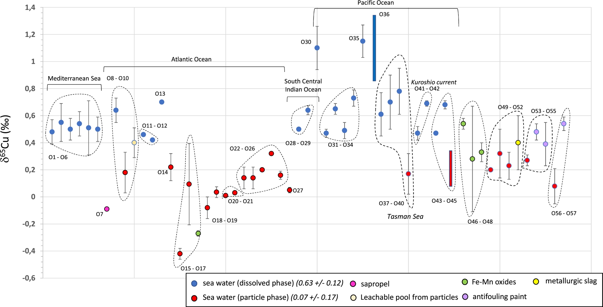 Type of sample and associated bibliographic reference for Oceans; the points surrounded by a dotted line proviennent d’une même zone géographique (China sea, Pacific Ocean). O1: Mediterranean sea (0.51 ± 0.2 (n = 96); Baconnais et al., 2019); O2: South Western Mediterranean sea (0.48 ± 0.09 (n = 23); Baconnais et al., 2019); O3: South Eastern Mediterranean sea (0.55 ± 0.14 (n = 19); Baconnais et al., 2019); O4: North Western Mediterranean sea (0.50 ± 0.08 (n = 21); Baconnais et al., 2019); O5: North Eastern Mediterranean sea (0.54 ± 0.09 (n = 14); Baconnais et al., 2019); O6: North Atlantic Ocean (0.50 ± 0.09 (n = 20); Baconnais et al., 2019); O7: Sapropel (−0.09 (n = 1); Maréchal et al., 1999); O8: South Atlantic (0.64 ± 0.09 (n = 63); Little, Archer, et al., 2018); O9: Particles from South Atlantic (0.18 ± 0.15 (n = 17); Little, Archer, et al., 2018); O10: Leachable pool from particles from South Atlantic (0.4 ± 0.11 (n = 16); Little, Archer, et al., 2018); O11: Near shore seawater (Halifax Harbour, North Atlantic) (= CASS-5 reference material) (0.46; K. V. Sullivan et al., 2022); O12: Seawater (Nova Scotia, North Atlantic) (NASS-6 reference material) (0.42; K. V. Sullivan et al., 2022); O13: English channel (0.7 (n = 1); Bermin et al., 2006); O14: Sediment from Atlantic Ocean (0.22 ± 0.1 (n = 8); Maréchal et al., 1999); O15: Suspended particle (lower fraction, <250 μm) from continental shelf of northern Bay of Biscay (north eastern Atlantic Ocean) (−0.42 ± 0.04 (n = 2); Araujo, Knoery, et al., 2022); O16: Suspended particle (coarse fraction, >250 μm) from inner continental shelf of northern Bay of Biscay (north eastern Atlantic Ocean) (0.09 ± 0.03 (n = 5); Araujo, Knoery, et al., 2022); O17: Plankton, BCR 414 Certified Reference Material) (−0.27 (n = 1); Araujo, Knoery, et al., 2022); O18: Surface sediments from the Loire estuary (France) (−0.08 ± 0.08 (n = 17); Araujo, Ponzevera, et al., 2019); O19: Paleovase from the Loire estuary (France) (0.03 ± 0.03 (n = 12); Araujo, Ponzevera, et al., 2019); O20: Marine sediments from Beaufort sea (MESS-3 reference material) (0.01; K. Sullivan et al., 2020); O21: Marine sediments from British Columbia (Canada) (PACS Certified Reference Material) (0.03; K. Sullivan et al., 2020); O22: Modern marine sediments (Cariaco basin) (0.14 ± 0.08 (n = 2); Little, Vance, McManus, et al., 2017); O23: Modern marine sediments (California borderland basin) (0.14 ± 0.08 (n = 4); Little, Vance, McManus, et al., 2017); O24: Modern marine sediments (Black Sea) (0.2 ± 0.01 (n = 4); Little, Vance, McManus, et al., 2017); O25: Modern marine sediments (Peru margin) (0.32 (n = 1); Little, Vance, McManus, et al., 2017); O26: Modern marine sediments (Mexican margin) (0.16 ± 0.03 (n = 3); Little, Vance, McManus, et al., 2017); O27: North Atlantic marine sediment (HISS-1 Certified Reference Material) (0.05 ± 0.02; Takano, Liao, Tian, et al., 2020); O28: South Central Indian Ocean (<100 m) (0.5 ± 0.01 (n = 4); Takano, Tanimizu, et al., 2014); O29: South Central Indian Ocean (>300 m) (0.64 ± 0.03 (n = 12); Takano, Tanimizu, et al., 2014); O30: South Central Indian Ocean (1.1 ± 0.16 (n = 12); Vance, Archer, et al., 2008); O31: Western North Pacific Ocean (<100 m) (0.47 ± 0.03 (n = 6); Takano, Tanimizu, et al., 2014); O32: Western North Pacific Ocean (>300 m) (0.65 ± 0.04 (n = 12); Takano, Tanimizu, et al., 2014); O33: Eastern North Pacific Ocean (<100 m) (0.49 ± 0.06 (n = 7); Takano, Tanimizu, et al., 2014); O34: Eastern North Pacific Ocean (>300 m) (0.73 ± 0.06 (n = 18); Takano, Tanimizu, et al., 2014); O35: North East Pacific Ocean (1.14 ± 0.12 (n = 11); Vance, Archer, et al., 2008); O36: North East Pacific (0.85–1.35 (range); Bermin et al., 2006); O37: North Tasman sea (SW Pacific Ocean) (0.61 ± 0.16 (n = 15); Thompson and Ellwood, 2014); O38: Mid Tasman sea (SW Pacific Ocean) (0.7 ± 0.2 (n = 17); Thompson and Ellwood, 2014); O39: South Tasman sea (SW Pacific Ocean) (0.78 ± 0.17 (n = 16); Thompson and Ellwood, 2014); O40: Particles from Tasman sea (SW Pacific Ocean) (0.17 ± 0.15 (n = 7); Thompson and Ellwood, 2014); O41: Surface water (<200 m) from Kuroshio current along the East China Sea (0.47 ± 0.05 (n = 37); Takano, Liao, Ho, et al., 2022); O42: Deep water (>600 m) from Kuroshio current along the East China Sea (0.68 ± 0.02 (n = 17); Takano, Liao, Ho, et al., 2022); O43: Northern South China Sea (<400 m) (0.47 (n = 1); Takano, Liao, Tian, et al., 2020); O44: Northern South China Sea (>400 m) (0.68 ± 0.03 (n = 4); Takano, Liao, Tian, et al., 2020); 045: Particles from Northern South China Sea (0.13–0.36; Takano, Liao, Tian, et al., 2020); O46: Fe–Mn nodules from Pacific Ocean (0.54 ± 0.04 (n = 8); Little, Vance, Walker-Brown, et al., 2014); O47: Fe–Mn nodules from Indian Ocean (0.28 ± 0.39 (n = 8); Little, Vance, Walker-Brown, et al., 2014); O48: Fe–Mn nodules from Atlantic Ocean (0.33 ± 0.07 (n = 8); Little, Vance, Walker-Brown, et al., 2014); O49: Natural background sediment from Sepetiba Bay (Brazil) (0.2 (n = 1); Jeong, Araujo, Garnier, et al., 2023); O50: Sediment from Sepetiba bay (Brazil), impacted by smelter (0.32 ± 0.18 (n = 13); Jeong, Araujo, Garnier, et al., 2023); O51: Sediment from Northern Sepetiba bay (Brazil) (0.23 ± 0.1 (n = 12); Jeong, Araujo, Garnier, et al., 2023); O52: Metallurgic slag from Sepetiba bay (Brazil) (0.4 ± 0.2; Jeong, Araujo, Garnier, et al., 2023); O53: Sediments from Busan Harbor (South Korea) (0.27 ± 0.04 (n =7); Jeong, Araujo, Knoery, et al., 2023); O54: Domestic Antifoulings paints (South Korea) (0.48 ± 0.06 (n = 5); Jeong, Araujo, Knoery, et al., 2023); O55: Imported antifouling sources paints (South Korea) (0.39 ± 0.16 (n = 4); Jeong, Araujo, Knoery, et al., 2023); O56: Cu-contaminated Mediterranean sediments from marina of Port Camargue (France) (0.07 ± 0.12 (n = 25); Briant et al., 2022); O57: Antifouling paints Cu-contaminated Mediterranean marina of Port Ca
