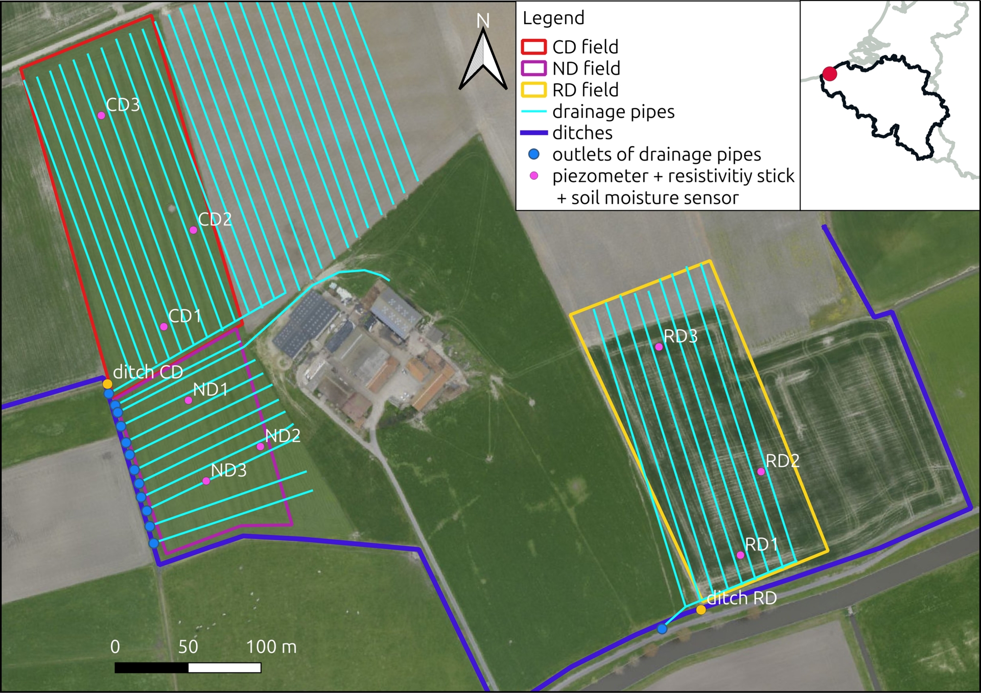Polders are low-lying coastal areas that used to be submerged at high tides. Progressively, dikes have been erected to prevent transgression from the sea and a network of ditches established to drain the land, making it suitable for agricultural activities. Polders can be found in the North of Belgium but also in the Netherlands, north-west of Germany, UK and in several other parts of the world. Originally, ditches were used to drain the land effectively. From the 1950, subsurface drains, initially ceramic, and more recently plastic, were buried in agricultural fields to improve the drainage, also in more sloping land Ritzema (1994). This led to larger field sizes that could be easily cultivated by agricultural machinery. These subsurface drains, also called tile-drains, are a very common agricultural improvement technique (Castellano et al., 2019). They bring the collected water from the field to its surrounding ditches. Within a polder, the water level in ditches is managed by a water board. They remove excess water by releasing it to the sea at low-tide either by gravity or by pumping. Drainage in the polder is essential to avoid flooding and keep the land dry enough for agricultural activity.