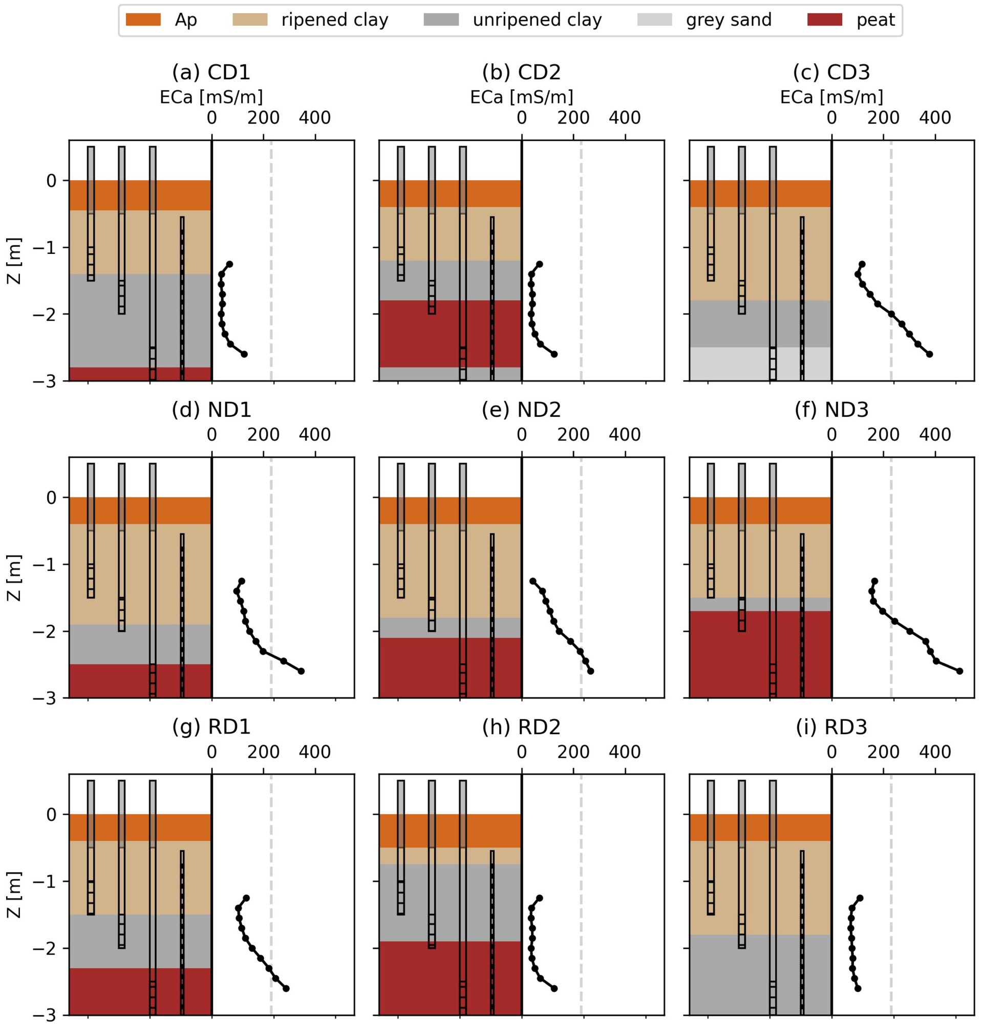 Within each field, three locations were monitored. At each location, three piezometers were placed up to depths of 1.5, 2 and 3 m below surface from North to South, spaced 0.5 m (Figure 2). The piezometers have a screen on the bottom 0.5 m. The top 1 m part of the piezometer (from −0.5 to 0.5 m above surface) can be removed which enables us to bury the piezometer when large machinery for ploughing, sowing or harvesting needs to go on the field. Water samples from all piezometers were collected monthly and measured with a general lab conductivity meter and a Na+ specific sensor (LAQUAtwin-Na-11, Horiba, Japan). The deepest piezometer of each location (e.g. CD1-300) was equipped with a CTD diver (Van Essen Instruments, Waterloo, Canada) or a DL-CTD10 (Decentlab, Dübendorf, Switzerland) to measure pressure, temperature and electrical conductivity (EC). The pressure data were corrected for barometric pressure variations to obtain raw water heads. Given that the density of saline water is larger than the density of freshwater, the same pressure at the sensor can be linked to different heads of water above it. Hence, the raw water heads were then corrected to freshwater heads based on the electrical conductivity observed (e.g. Vandenbohede, Lebbe, et al., 2008). The difference between raw water heads and corrected freshwater heads was less than 0.015 m. From manual augering, different soil layers were identified from top to bottom: first an Ap layer used for agricultural activities, then a consolidated clay layer with traces of rust, then unconsolidated (unripened) clay (i.e. clay that was always under the water table, that never consolidated or ripened in unsaturated condition) were found. In some locations, peat layers were found. In addition to the piezometers, each location is also equipped with an ERT stick with 16 ring electrodes, spaced 0.15 m with the first electrode at 3.05 m depth and the last at 0.8 m depth below surface. The sticks in CD and RD fields have a diameter of 0.05 m, stainless steel electrodes rings internally connected. Spacers between rings are made of plastic and screw into each other. This modular design enables us to build a stick of the desired length. The sticks in the ND field are built around a bamboo stick of 0.015 m diameter. The electrodes are made with the last 0.3 m naked extremities of the cable (tinned copper) coiled and soldered on top of aluminium foil to increase contact area. This design, while less robust, is cheaper and similar data quality (reciprocal error, stacking error, contact resistances) is observed for both types of sticks. A Wenner sequence where potential electrodes are between the current electrodes, all four electrodes equally spaced was used. This sequence was acquired monthly with a Syscal Pro 120 (Iris Instrument, Orléans, France). A PRIME geoelectrical monitoring system (e.g. Chambers et al., 2022) was also used to monitor the sticks in CD1 and CD2 daily with the same sequence. Figure 2 shows the apparent electrical conductivity (ECa) derived from the ERT readings along the sticks. The ECa increases with depth and this increase is often associated with the presence of peat. Locations without peat in the first 3 m (like RD3) show a lower ECa value. Time-domain transmission soil moisture sensors (TMS-4, TOMST, Wild et al. 2019) were installed at depth of 0.15, 0.3 and 0.45 m at all CD and RD locations and in ND1. These sensors were also installed at 1, 1.5 and 2 m to measure soil temperature variation. Frequency domain electromagnetic induction (EMI) data were collected using a DUALEM-421S (Dualem Inc., Canada) that can measure up to 6 different coil configurations: PRP1.1 (perpendicular orientation with 1.1 m between transmitter and receiver coil), PRP2.1, PRP4.1, HCP1 (horizontal coplanar orientation), HCP2 and HCP4.
