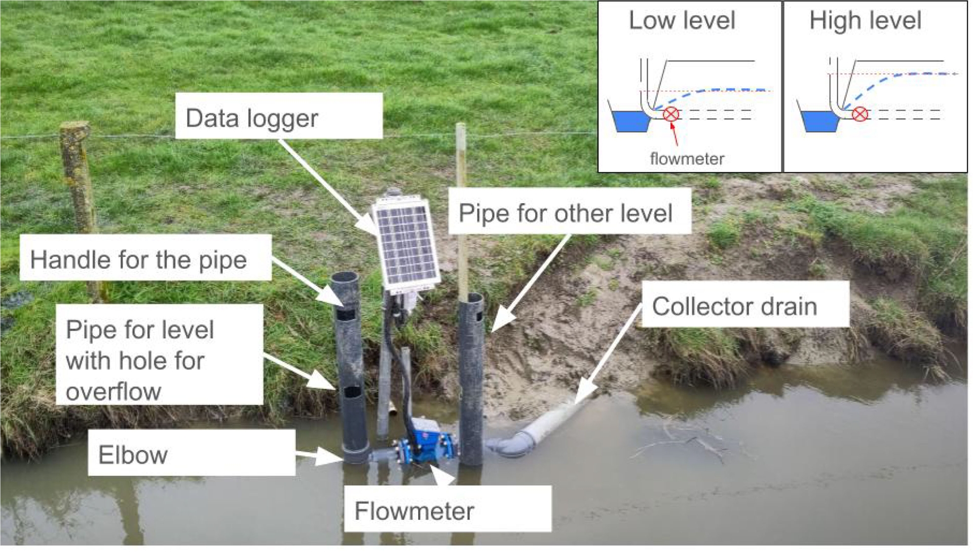 Controlled drainage system located in the RD field with the collector drain coming from the field going through the flowmeter, then the elbow on top of which a vertical pipe section with holes to a defined height is placed to apply the desired water level. Usually, this setup is placed in a control pit within the field to not block the waterways.