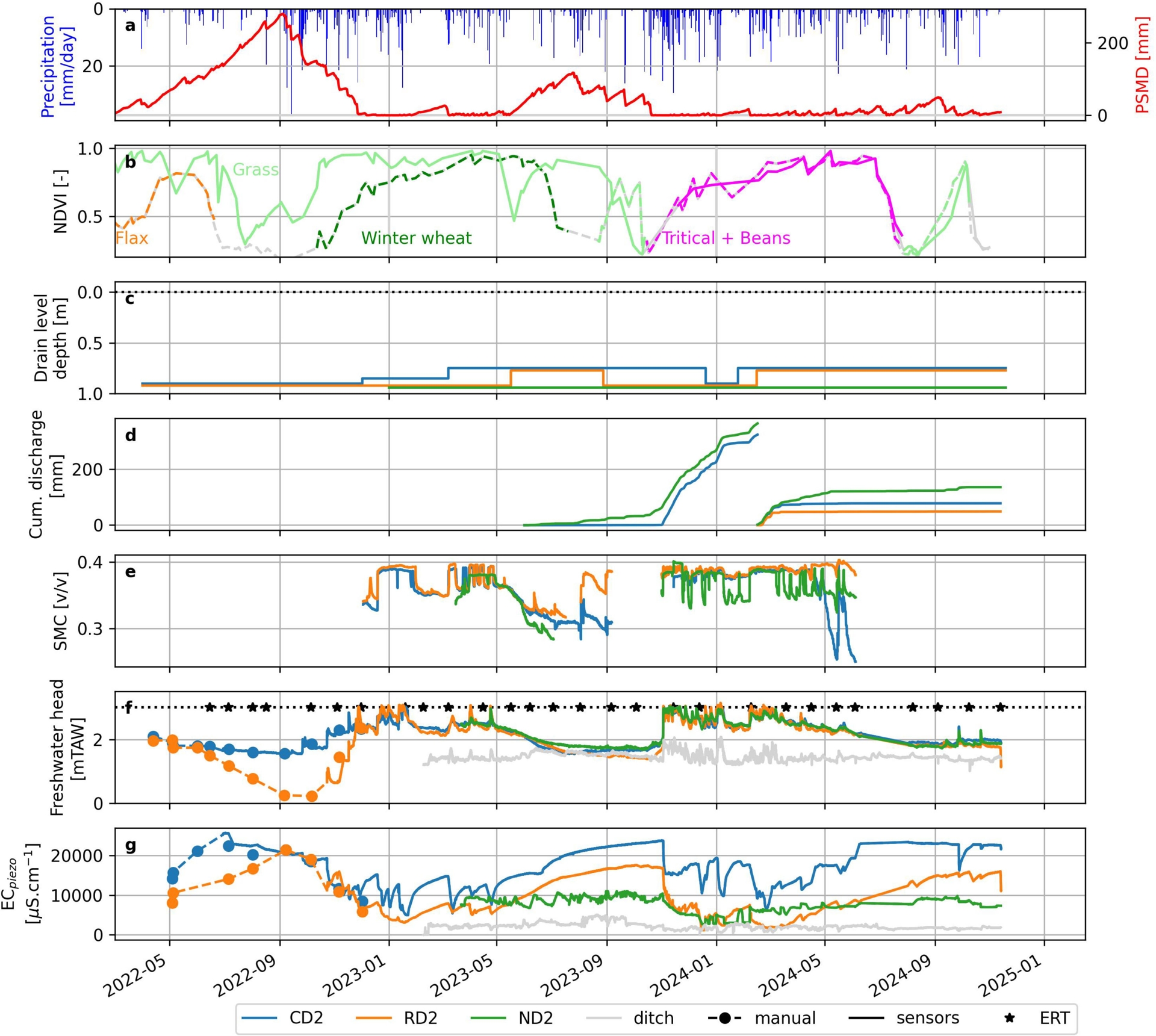 Three year time series showing: (a) daily precipitation and potential soil moisture deficit (i.e. cumulated potential evapotranspiration–precipitation), (b) normalised difference vegetation index (NDVI) obtained from remote sensing showing the crops in CD & ND (dashed line) and RD (solid line) fields, (c) water level imposed in the control pits, (d) cumulative yearly discharged observed (reset to 0 on 1st March), (e) volumetric soil moisture content at 0.3 m depth (SMC), (f) freshwater heads and (g) electrical conductivity of the water inside the piezometers. These time-series combined manual (dots) and sensor (line) data for one location per field (CD2, RD2, ND2) as well as for the ditch close to the RD outlet. Acquisition days of electrical resistivity tomography (ERT) are denoted by stars in (f).