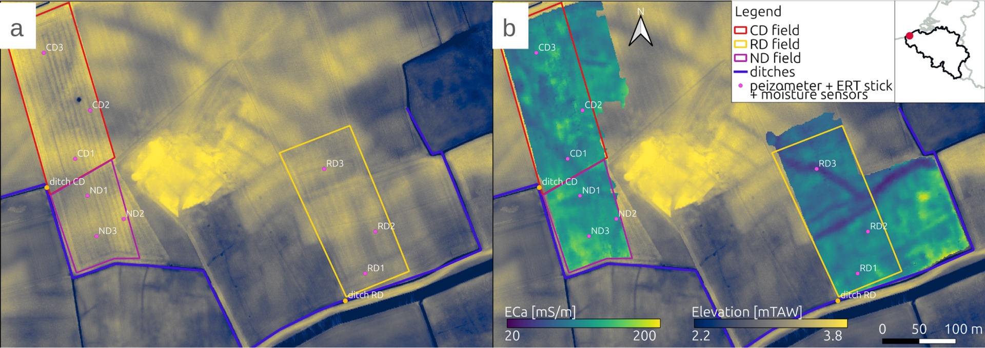 EMI mapping and the micro-topography map demonstrated the field displays significant spatial heterogeneity. Figure 5 shows the digital elevation model (DOV), revealing microtopographical variations related to buried landforms and past land use. Figure 5b shows the map of the EMI on top of the elevation model. Low-lying areas are generally associated with a higher ECa. EMI data also reveal the presence of less conductive linear features in the RD field, with RD3 being placed just in the middle of one of these. These are likely related to past hydrological structures (palaeochannels) that have been filled in with less conductive (sandy) deposits. We hypothesize that this palaeochannel system continues in the CD field at CD1, and then extends further north-west. Augerings conducted during piezometer installation confirm that RD3 and CD1 are more sandy at depth.