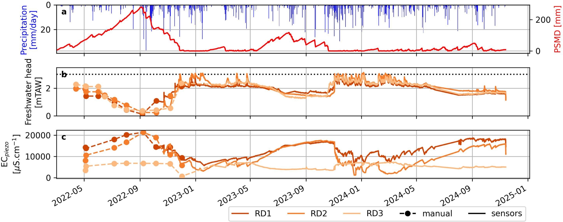 (a) Rainfall and potential soil moisture deficit (PSMD = cumulated potential evapotranspiration—precipitation). (b) Freshwater head and (c) electrical conductivity in the 3 m piezometer.