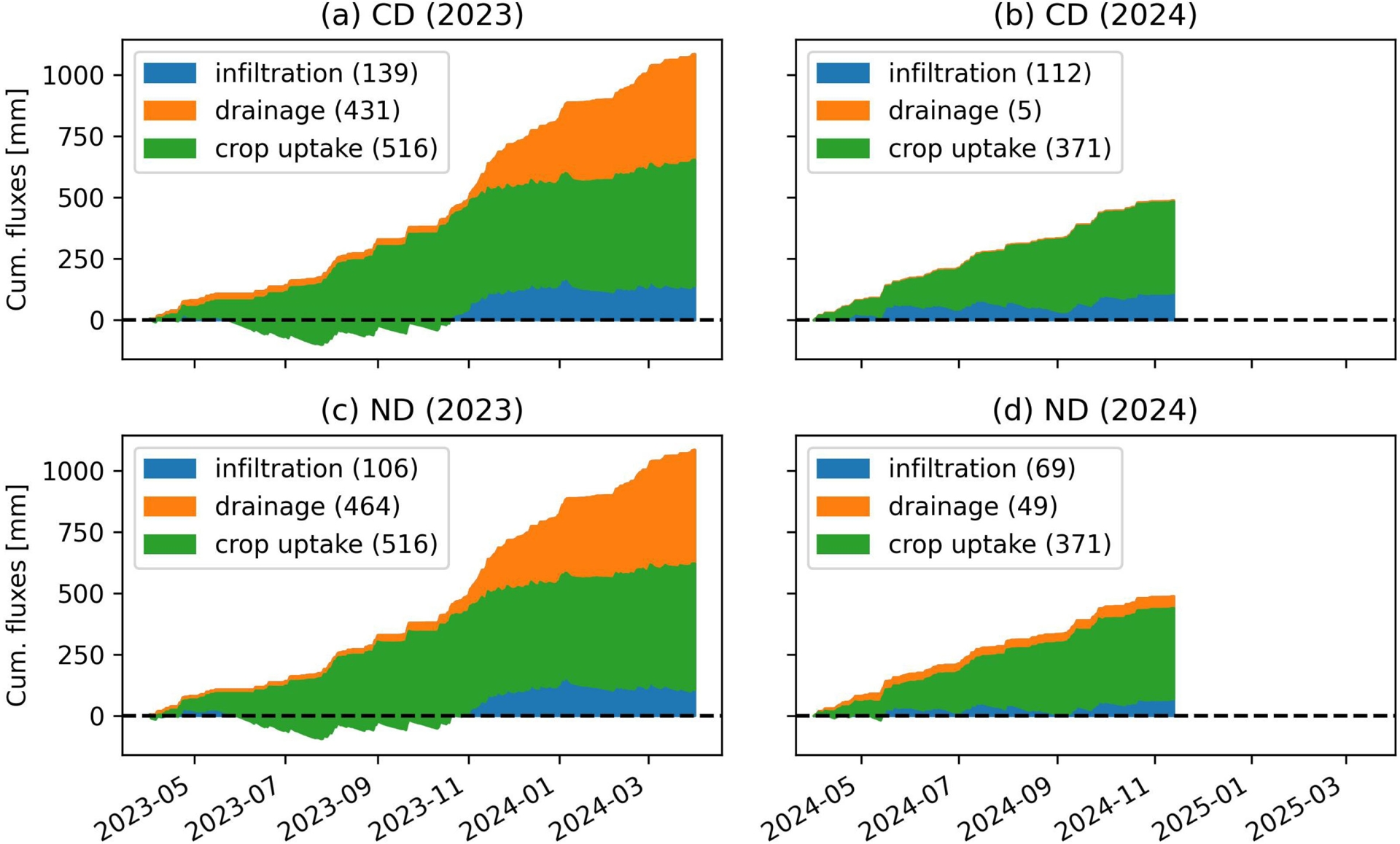 One of the goals of controlled drainage is to store more freshwater than in the case of regular drainage. Figure 7 proposes an estimation of the repartition of the precipitation into different fluxes. It shows that most of the drainage and the infiltration occurs during winter months. Little drainage occurs during summer, mainly during intense precipitation events. We previously showed that the water from intense precipitation events is drained out of the field into regular drainage (ND field), while controlled drainage (CD field) retains this water so that it remains available to the crop later in the season. This explains the difference in total drainage observed in 2023 and 2024 between CD and ND. 33 (2023) and 44 mm (2024) of water was buffered in the controlled drainage field (CD). This amount, while representing less than 10% of the total water drained during a season, is the equivalent of one irrigation event.