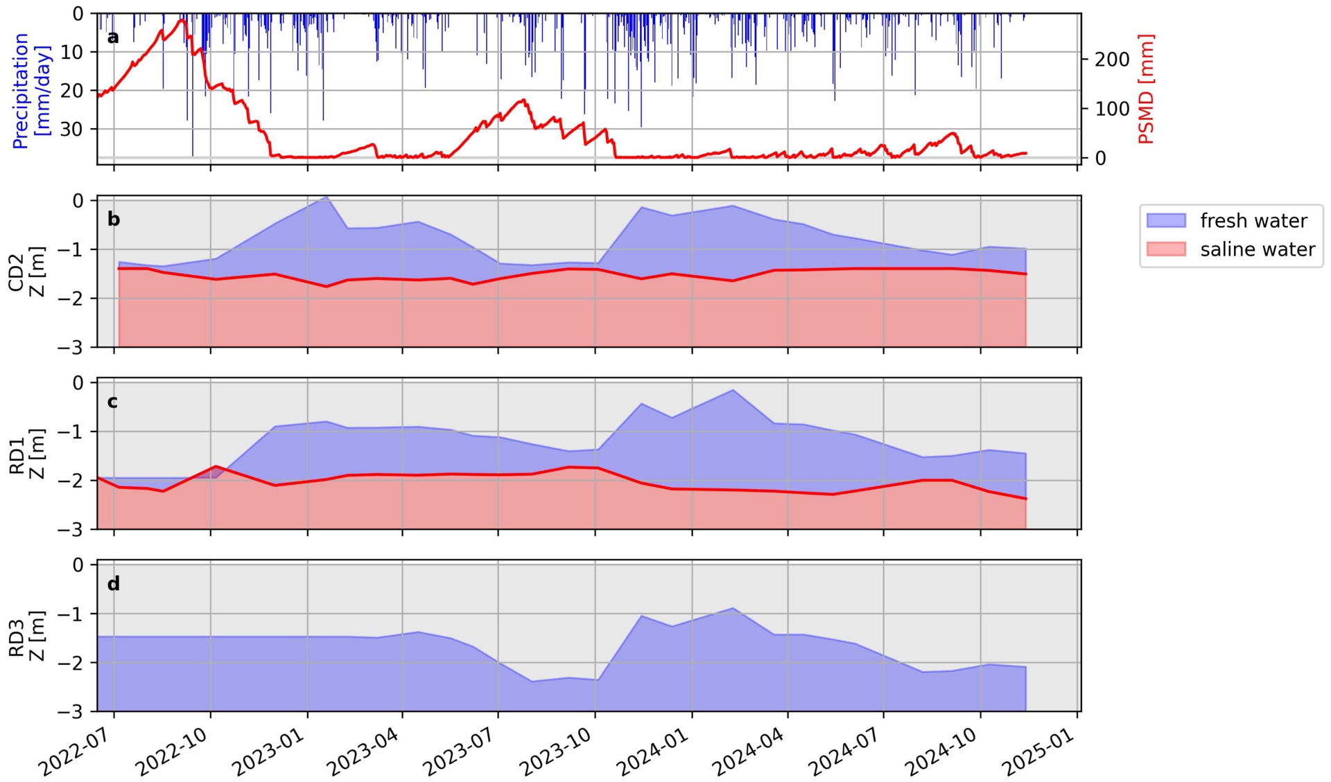 (a) Rainfall and potential soil moisture deficit (PSMD = cumulated potential evapotranspiration–precipitation). (b–d) Estimations of the thickness of the freshwater lens based on a 230 mS/m threshold applied on the apparent electrical conductivity from the ERT sticks. The time resolution of this figure was adapted to follow the resolution of the ERT surveys that were carried out every month (precise dates in Figure 4c).