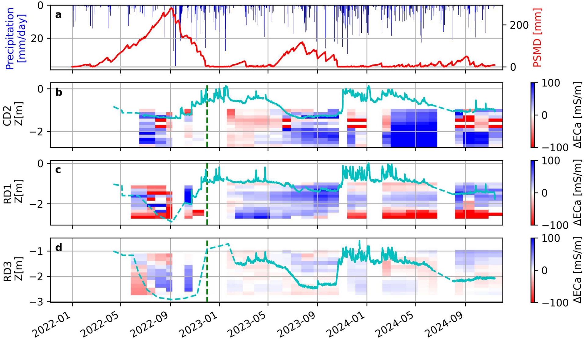 (a) Rainfall and potential soil moisture deficit (PSMD = cumulated potential evapotranspiration—precipitation). (b) Difference in apparent electrical conductivity for three locations with the water table in cyan. Differences are computed compared to a “wet reference” survey denoted by the vertical dashed green line. Increase in ECa can be associated with increase in saturation above the water table and increase in salinity below the water table.